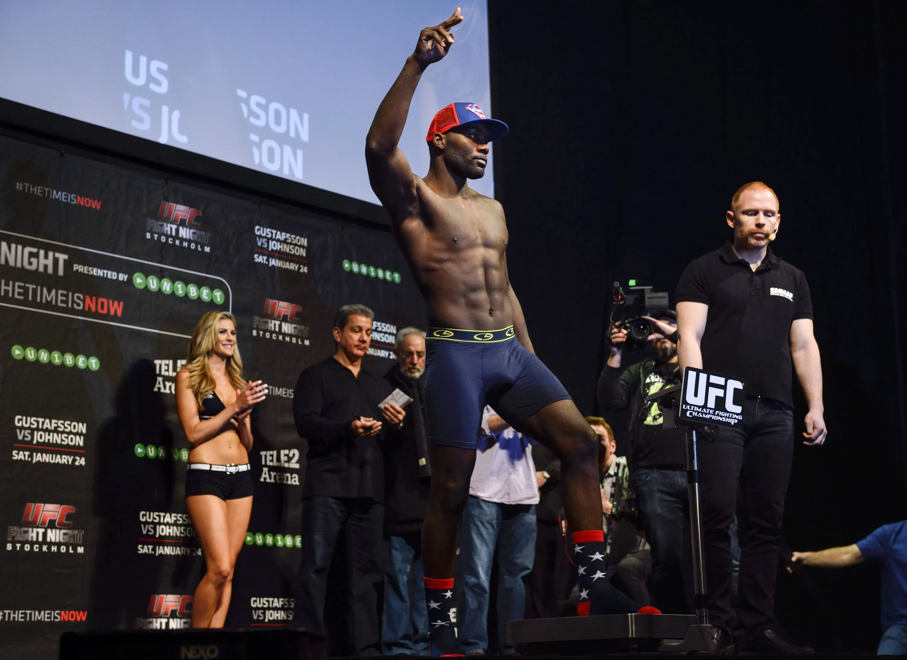 Anthony “Rumble” Johnson of the U.S. poses on the scale during the weigh-in for Saturday's UFC light heavyweight championship mixed martial arts bout at Tele2 Arena in Stockholm, January 23, 2015. (Photo by Henrik Montgomery/Reuters/TT News Agency)