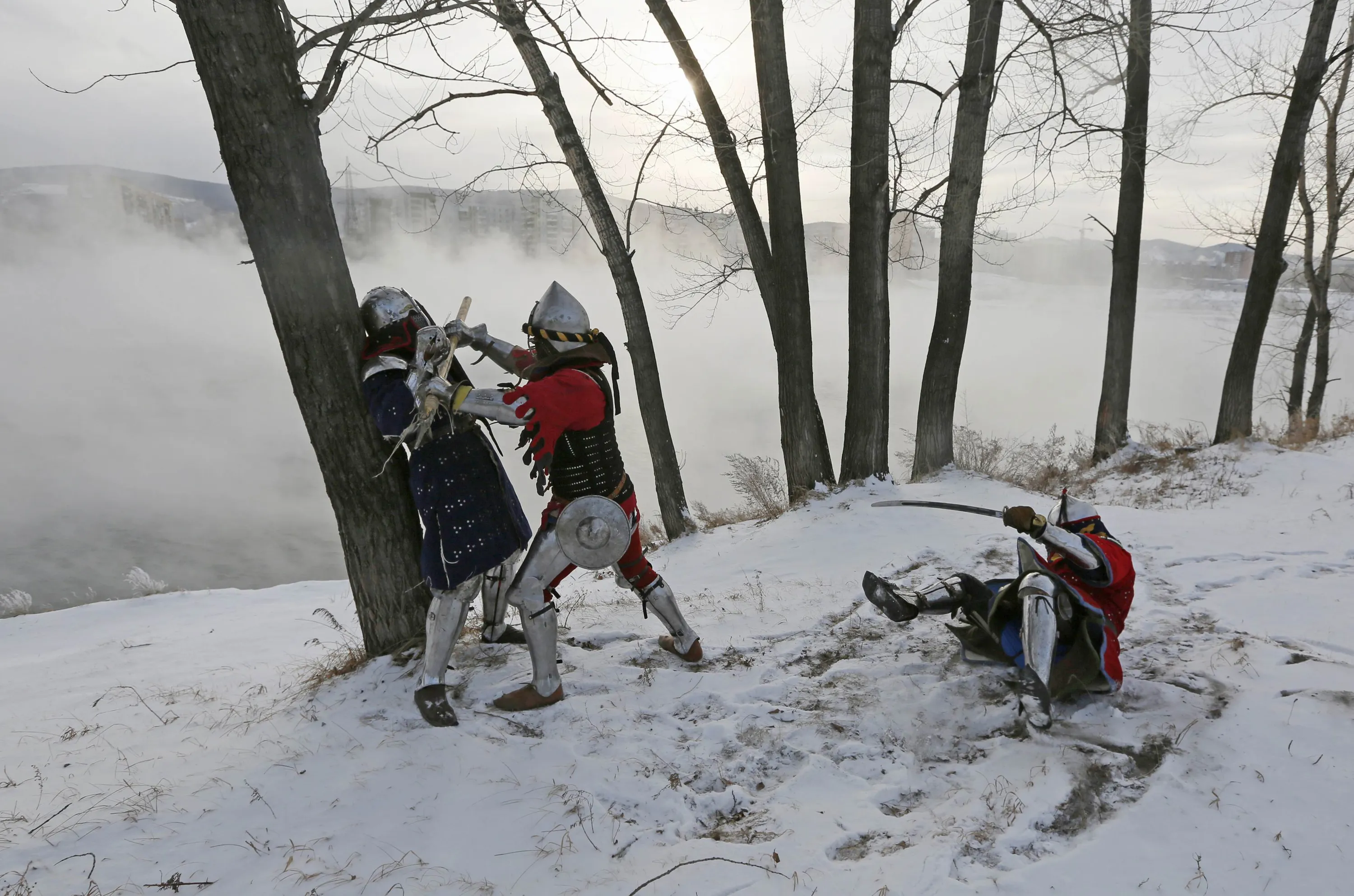 Members of the “Avalon” team wearing 14th century knight costumes fight against each other on the bank of the Yenisei River during the regional amateurs tournament of clubs of historical reconstruction, “The Battle of the Nations 2015. Siberia”, in Krasnoyarsk January 24, 2015. (Photo by Ilya Naymushin/Reuters)