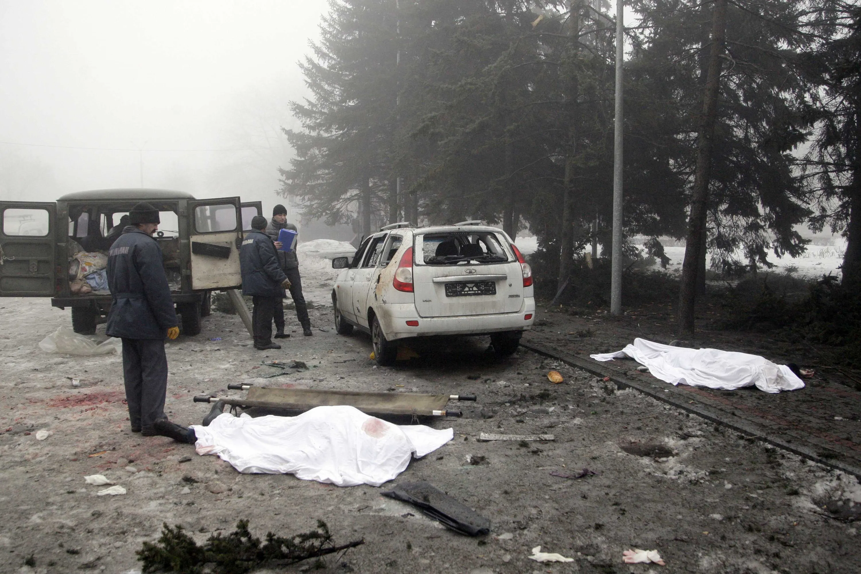 Men look at the covered bodies of victims at a site hit by shelling in Donetsk January 30, 2015. Civilians were killed on both sides in heavy fighting in eastern Ukraine on Friday, while an attempt to reopen peace talks in neighbouring Belarus was aborted before it began. Shells hit a cultural centre and a trolley bus in the eastern Ukrainian city of Donetsk on Friday, killing at least six people, Reuters journalists in the city said. The separatists said the total death toll in those two strikes was seven. (Photo by Alexander Ermochenko/Reuters)