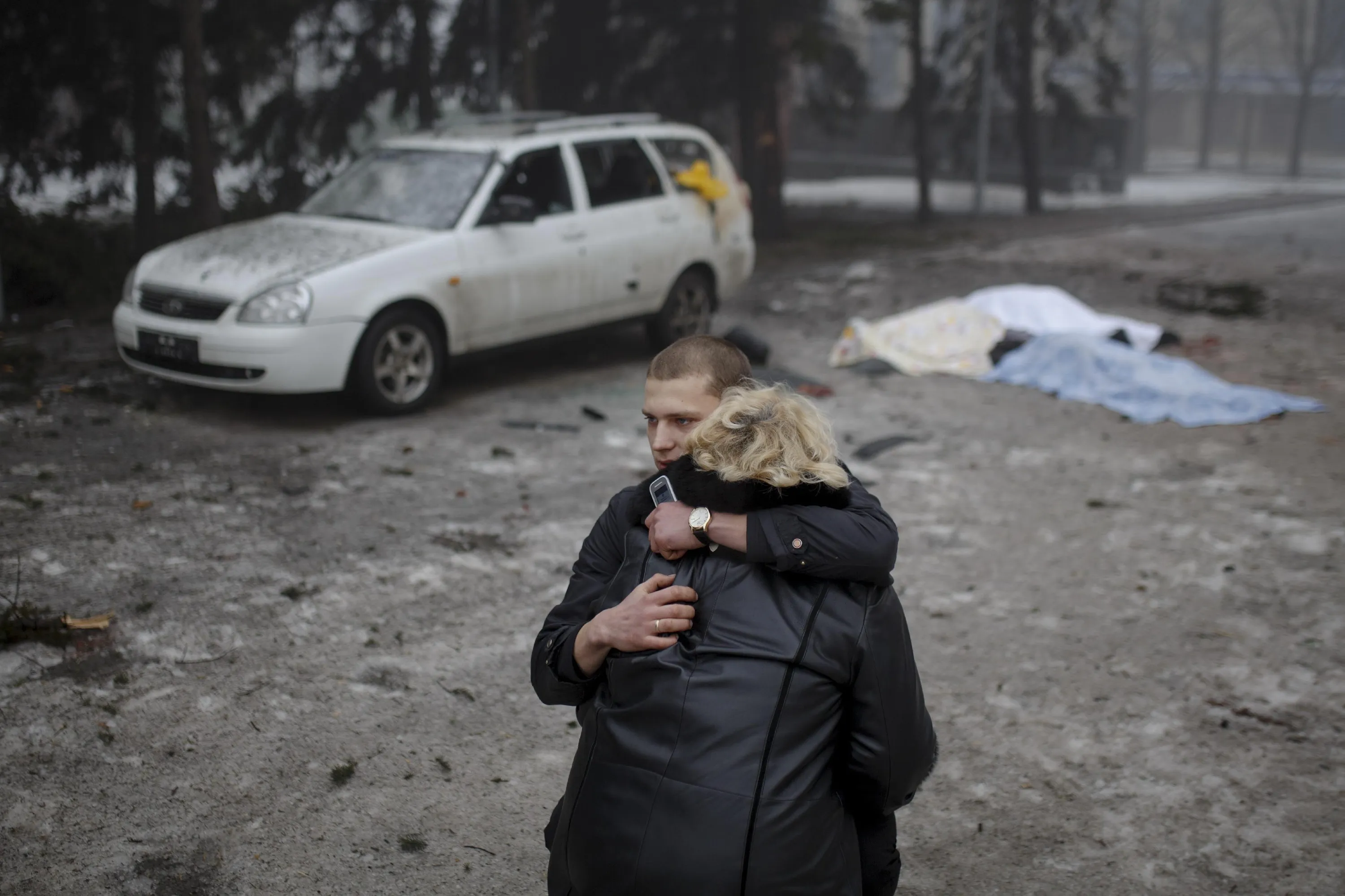 A rebel comforts a wife of a killed civilian in shelling in Donetsk, eastern Ukraine, Friday, January 30, 2015. (Photo by Vadim Braydov/AP Photo)
