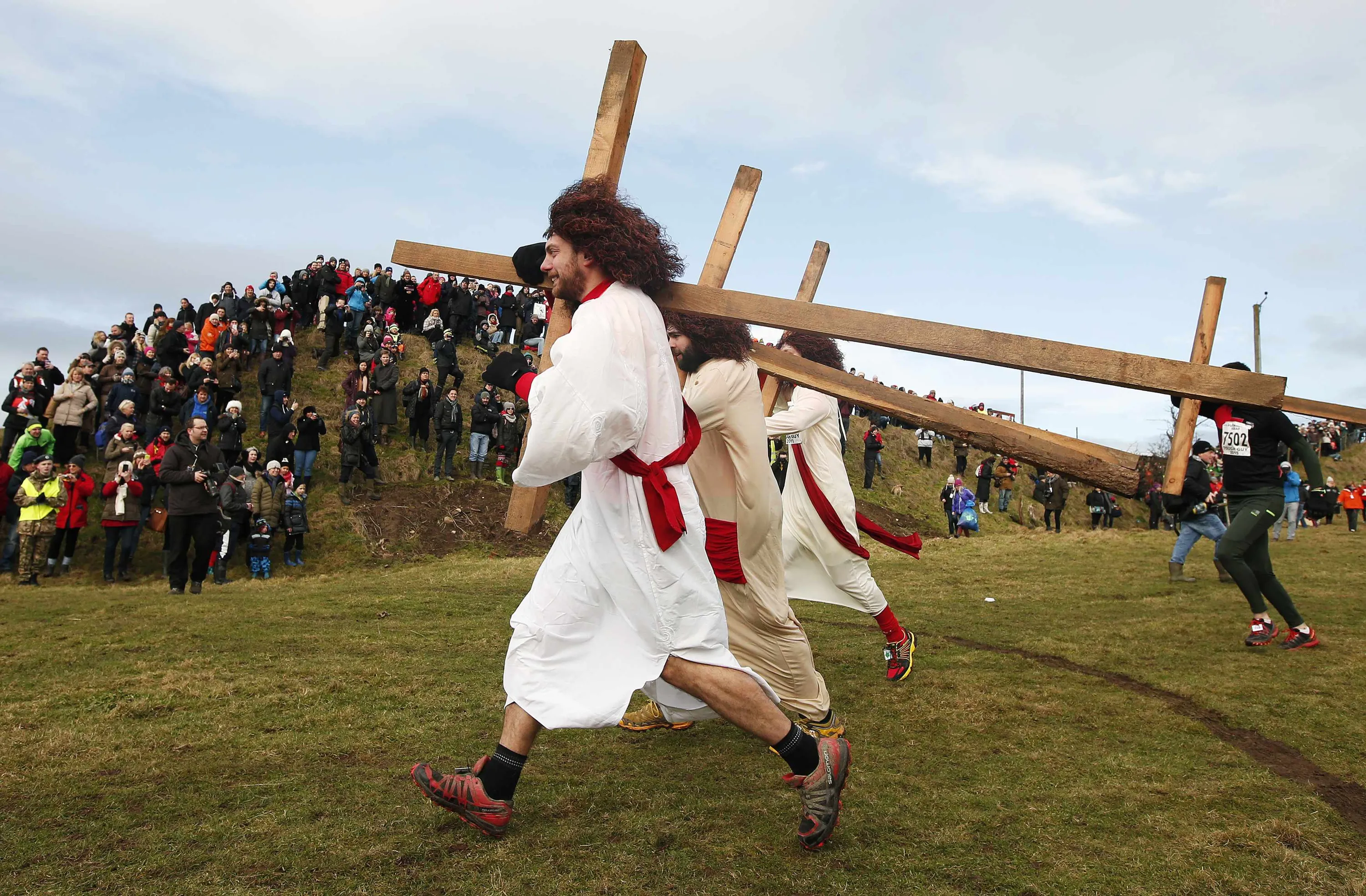 Competitors dressed as Jesus carry crosses as the start the Tough Guy event in Perton, central England, February 1, 2015. (Photo by Phil Noble/Reuters)