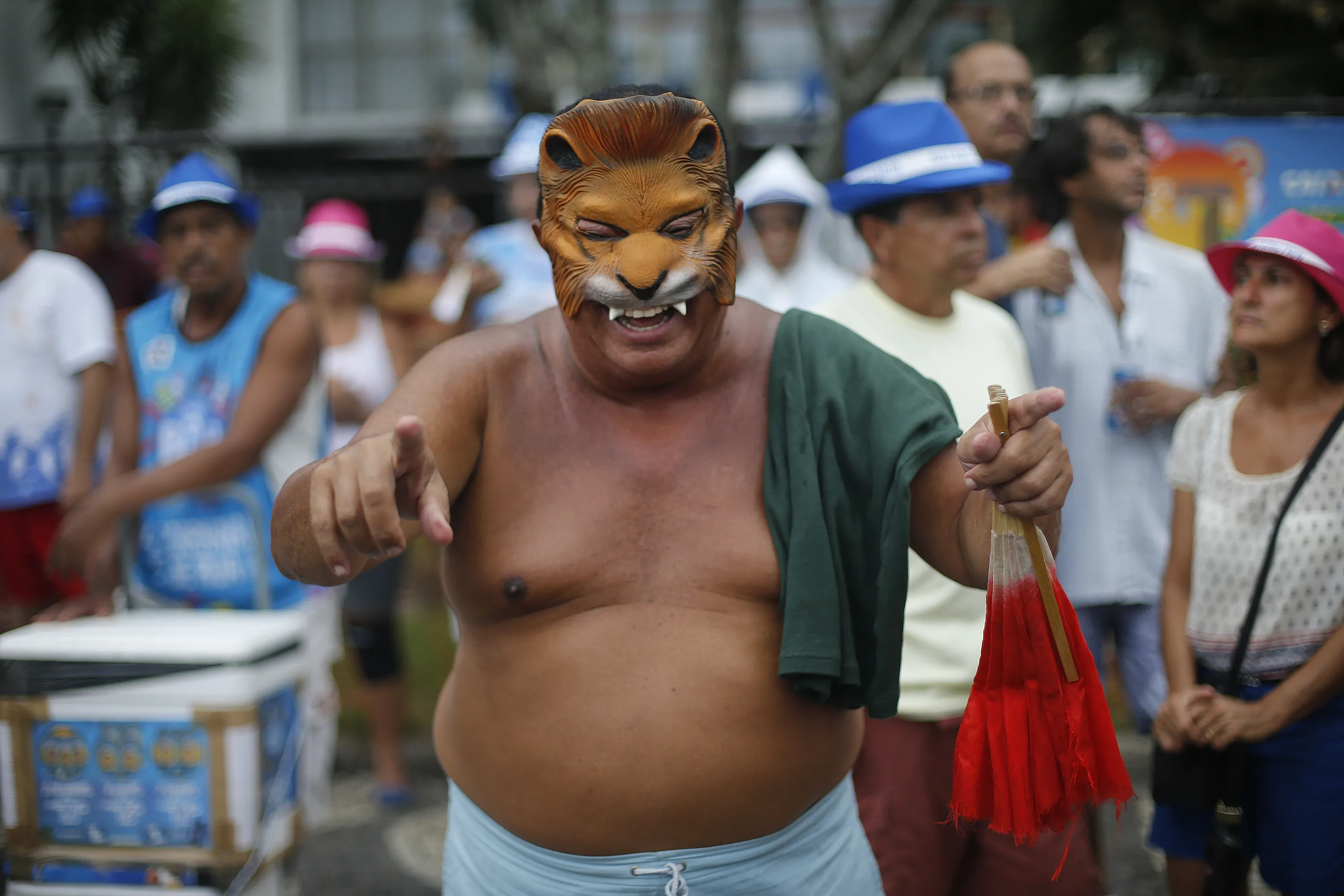A man wears a mask during the Banda de Ipanema carnival parade in Rio de Janeiro, Brazil, Saturday, January 31, 2015. (Photo by Silvia Izquierdo/AP Photo)