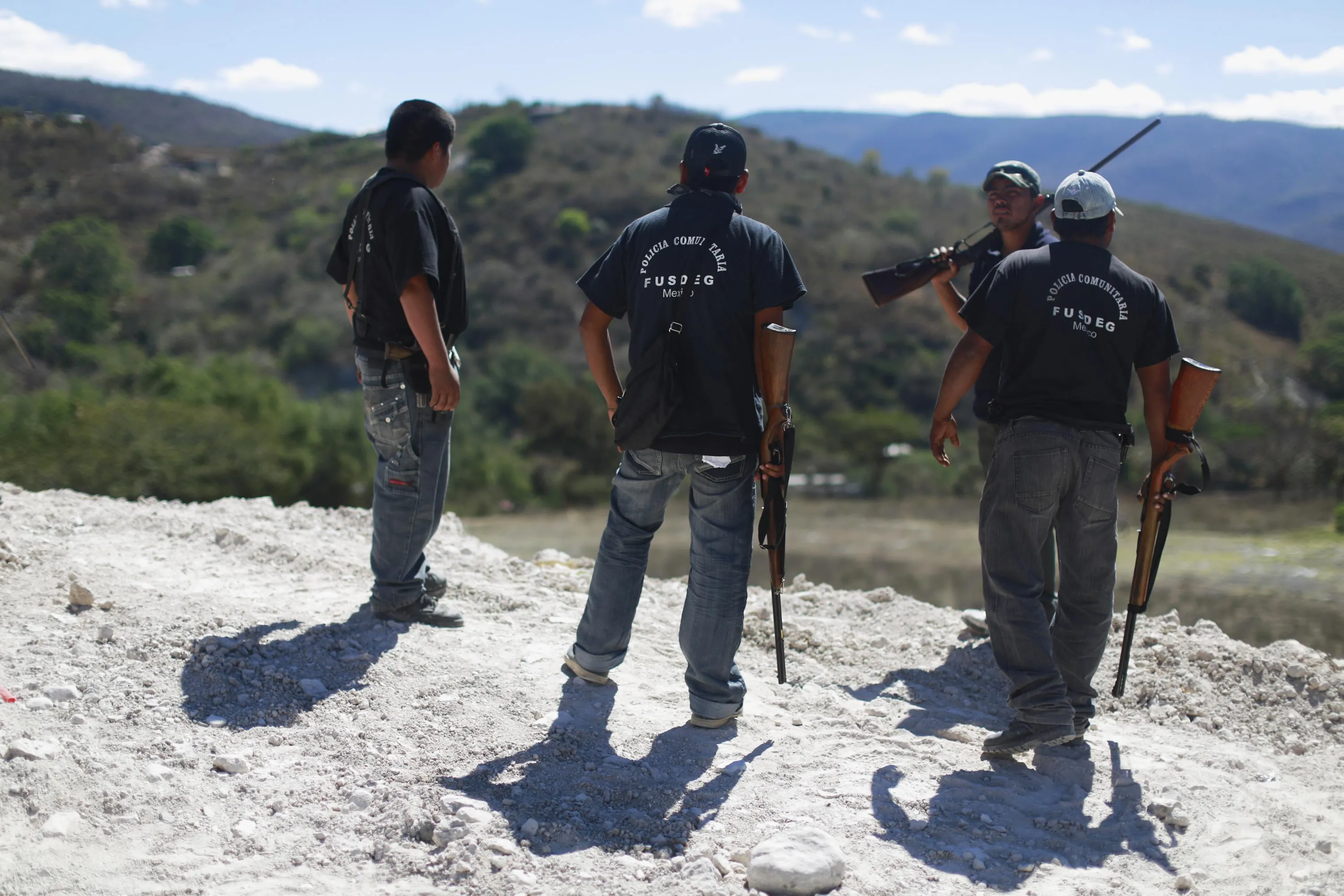 Members of the Community Police of the FUSDEG (United Front for the Security and Development of the State of Guerrero) stand on a hill during a patrol in the village of Petaquillas, on the outskirts of Chilpancingo, in the Mexican state of Guerrero, February 1, 2015. (Photo by Jorge Dan Lopez/Reuters)