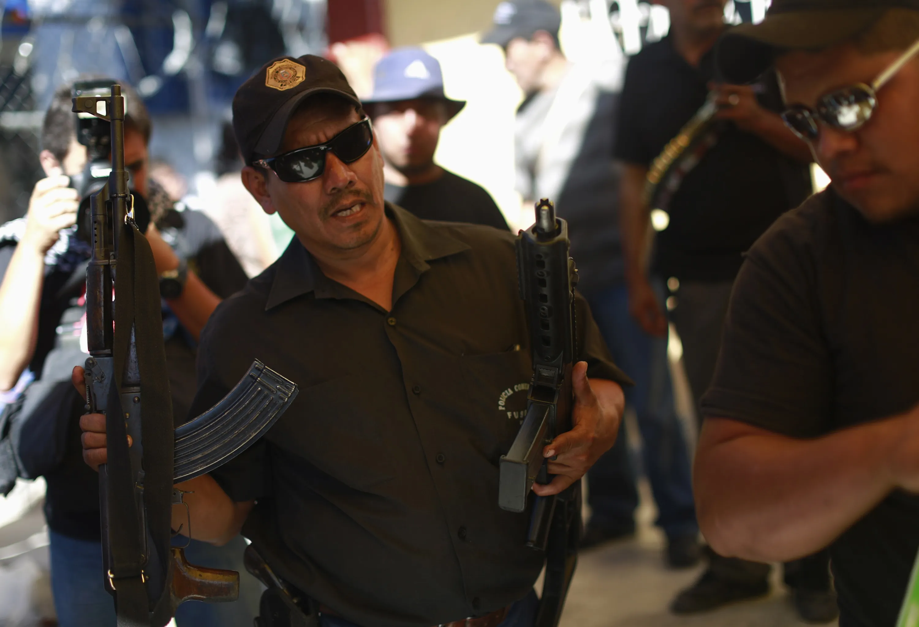A member of the Community Police of the FUSDEG (United Front for the Security and Development of the State of Guerrero) carries weapons, that were seized from a house during an operation, to be displayed at a presentation in the village of Petaquillas, on the outskirts of Chilpancingo, in the Mexican state of Guerrero, February 1, 2015. (Photo by Jorge Dan Lopez/Reuters)