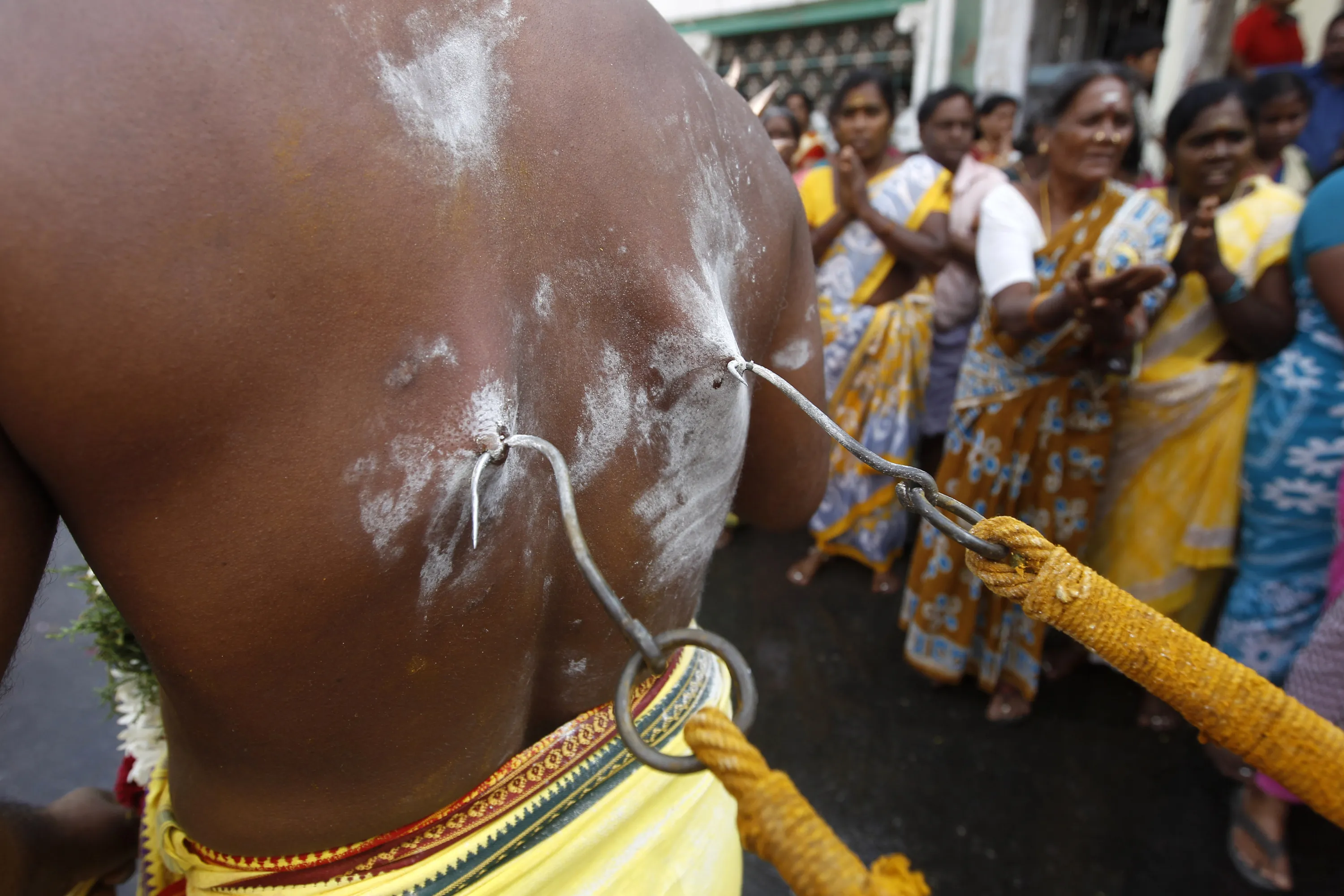 A Hindu devotee, his body pierced with metal hooks, pulls a chariot carrying a deity of Hindu god Lord Murugan during a religious procession marking Thaipusam festival in Chennai, India, Tuesday, February 3, 2015. (Photo by Arun Sankar K./AP Photo)