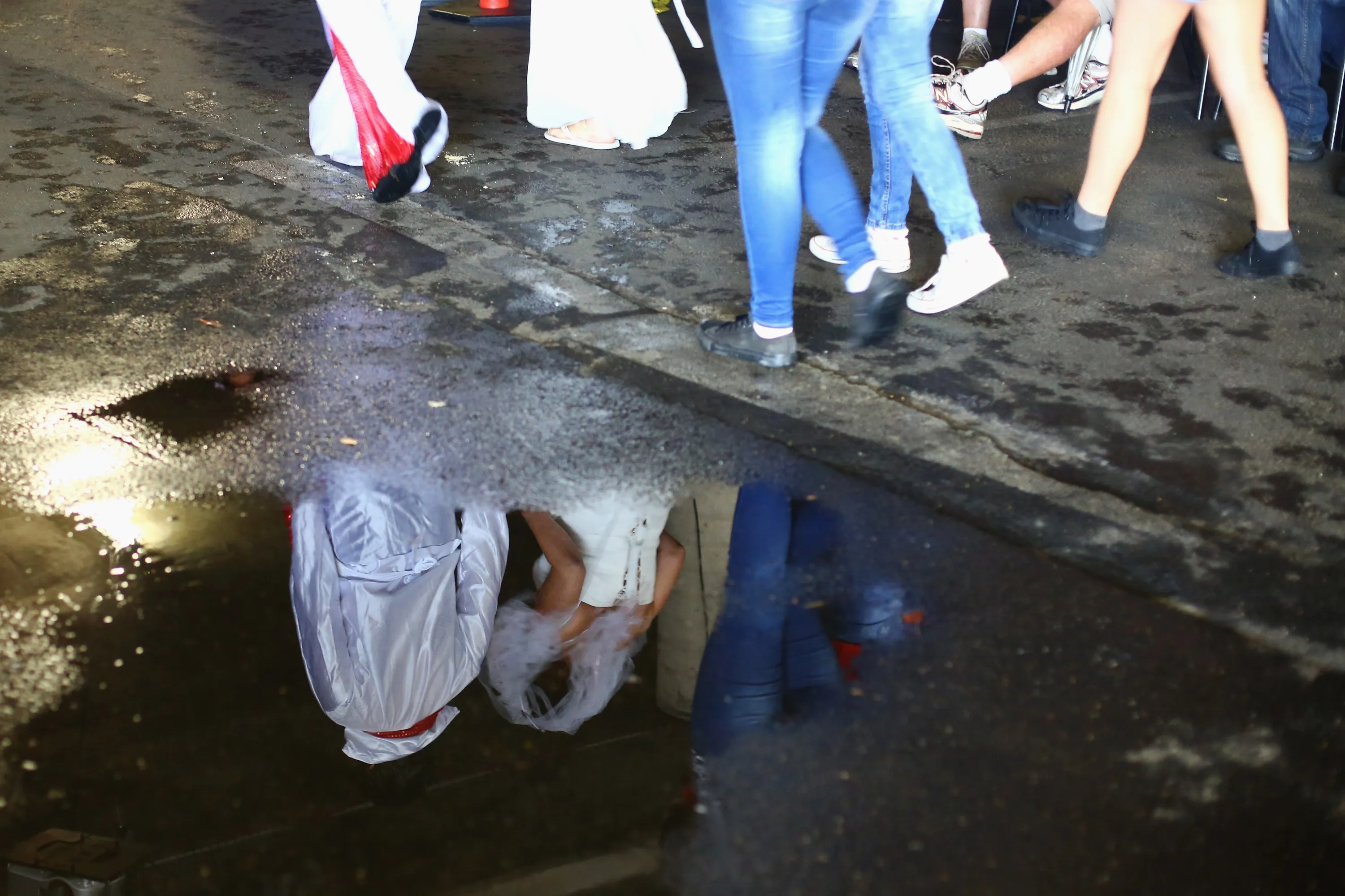 Chris Madoyris dressed as Elvis and his wife Mary Madoyris dressed as a bride arrive at the renewal of vows ceremony in the Big W carpark during the Parkes Elvis Festival on January 11, 2015 in Parkes, Australia. The Parkes Elvis Festival is held annually over five days, timed to coincide with Elvis Prestly's birth date in January. Over 1300 attendees are expected this year, marking Elvis' 80th birthday. (Photo by Mark Kolbe/Getty Images)