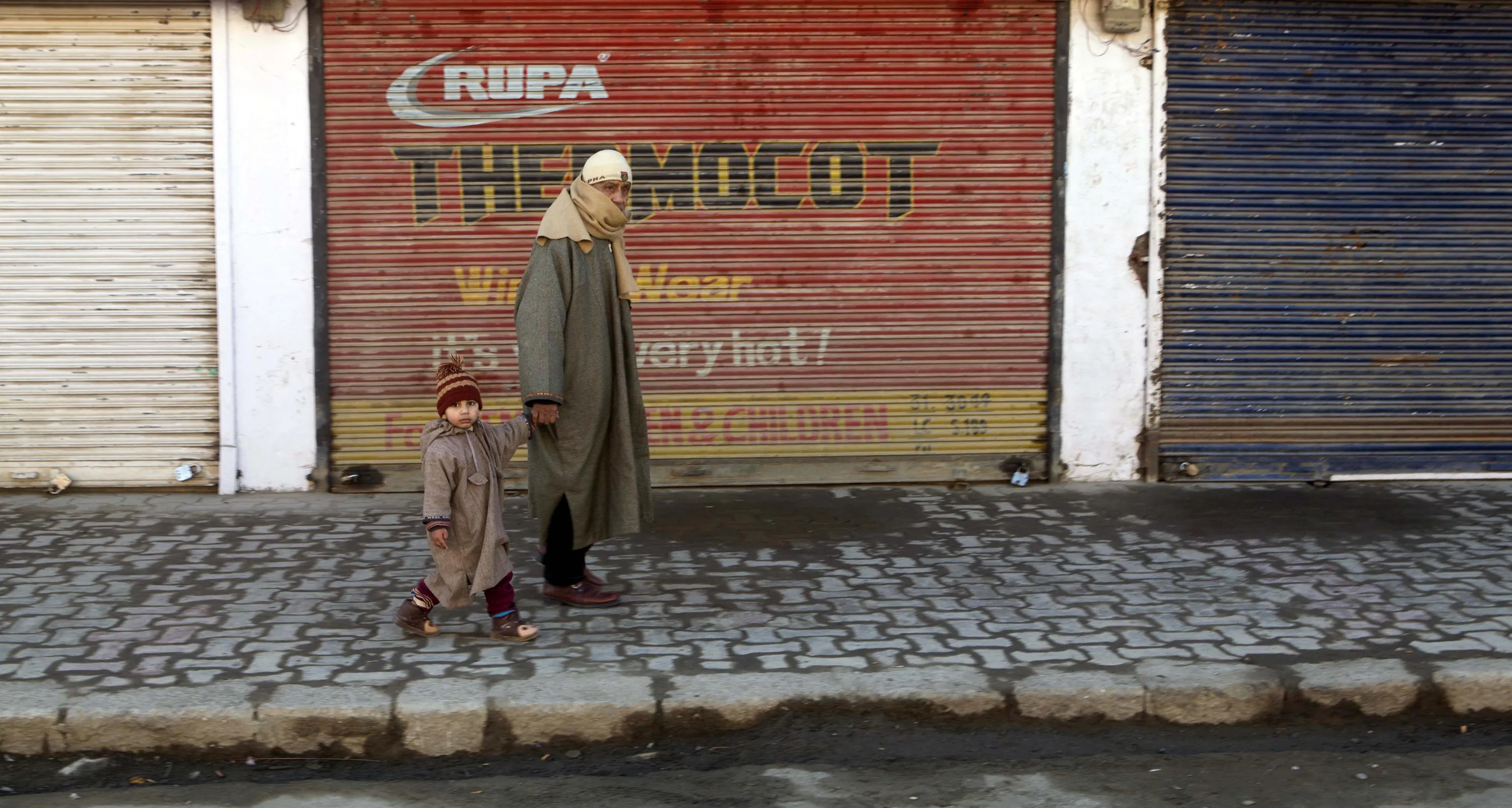 An man walks with a child past closed shops during a general strike in Srinagar, India, Monday, January 26, 2015. Shops remained closed Monday on India's Republic Day as separatists called for a general strike in the Indian-controlled portion of the disputed Kashmir region. (Photo by Dar Yasin/AP Photo)