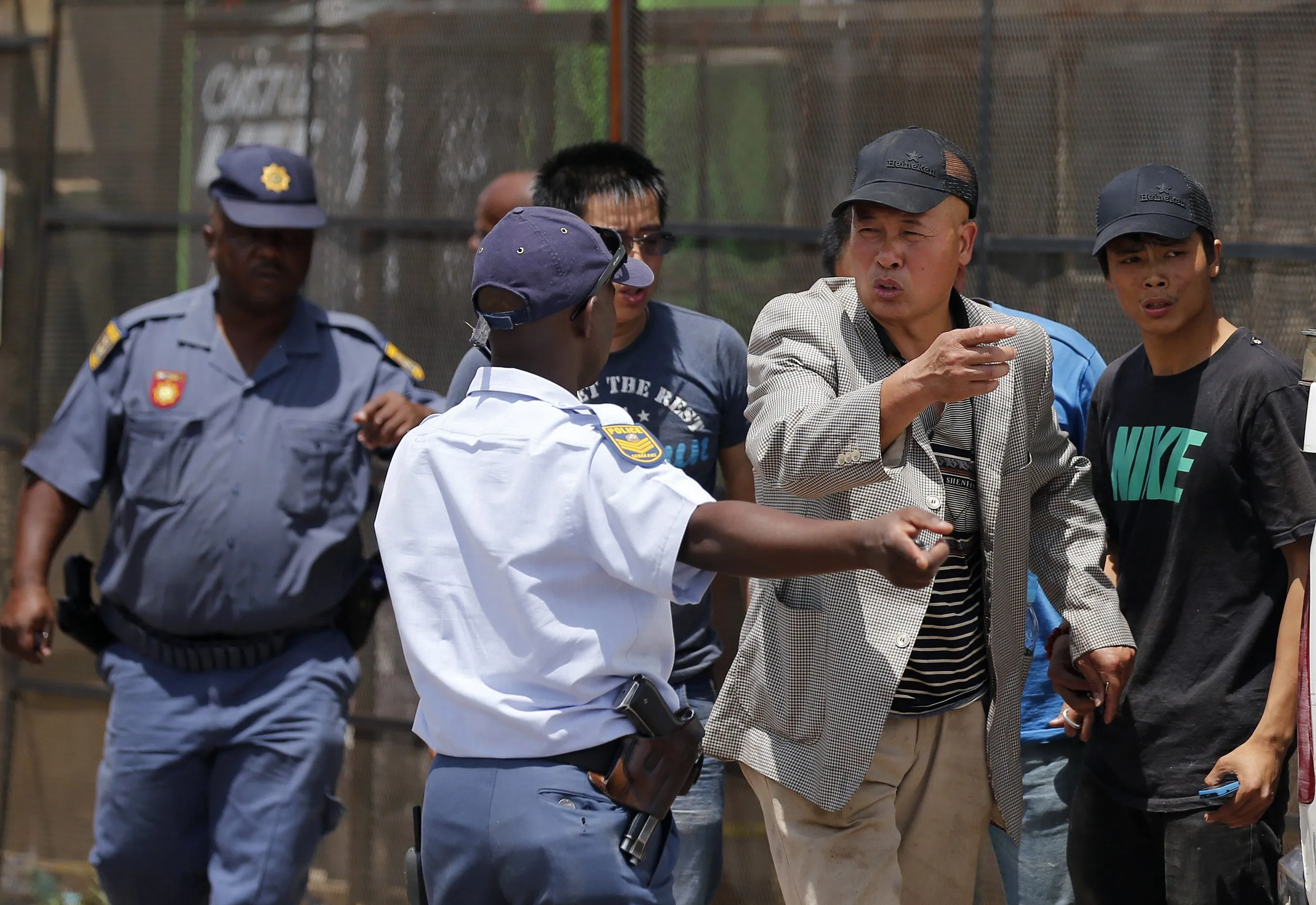 A foreign shop owner gestures as he talks to a police officer after their shops were looted during service delivery protests in Mohlakeng, west of Johannesburg, February 4, 2015. (Photo by Siphiwe Sibeko/Reuters)