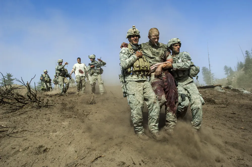 Spc. Carl Vandeberge, center, and Sgt. Kevin Rice, behind, are assisted as they walk to a medevac helicopter on October 23, 2007, minutes after they were shot during a Taliban ambush, which killed one soldier. Vandeberge and Rice were flown out immediately for surgery. (Photo by Lynsey Addario)