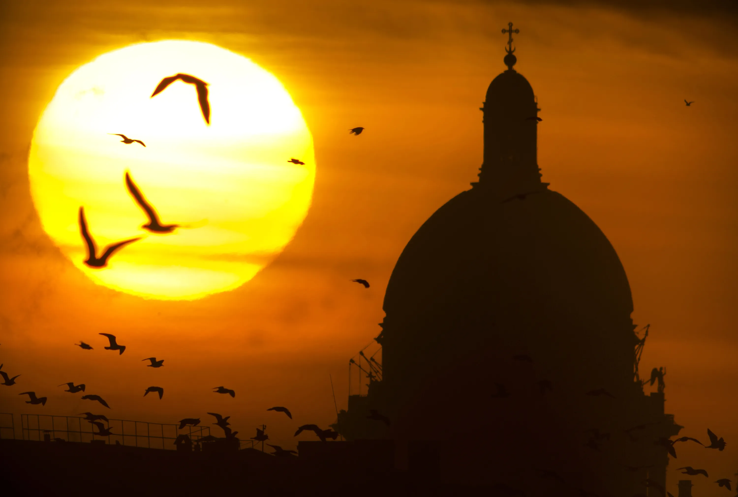 The city's landmarks St. Isaak's Cathedral is silhouetted as the sun sets in St. Petersburg, Russia, Wednesday, January 21, 2015. (Photo by Dmitry Lovetsky/AP Photo)