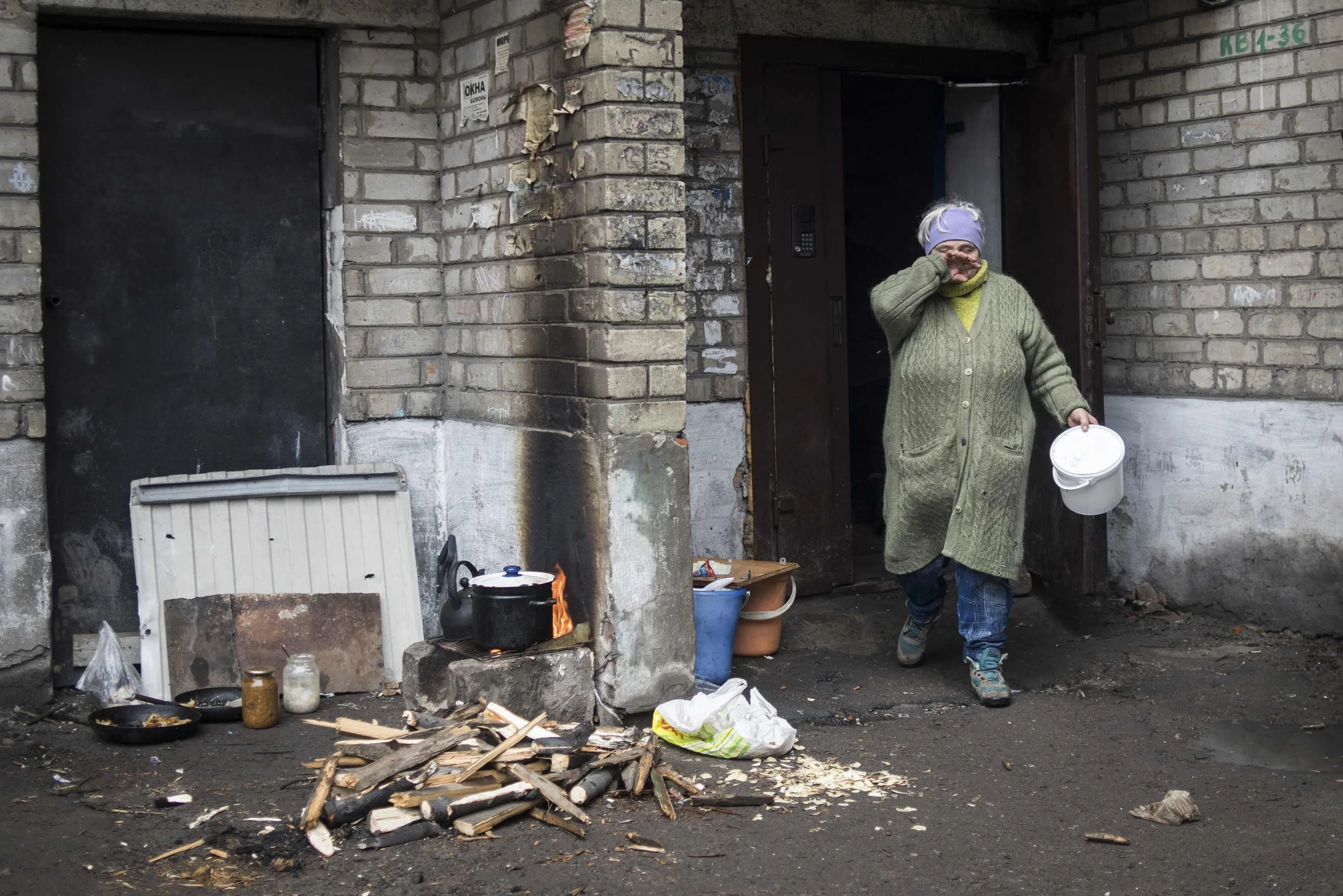 A woman walks to cook on a fire outside her house in Debaltseve, February 3, 2015. (Photo by Sergey Polezhaka/Reuters)