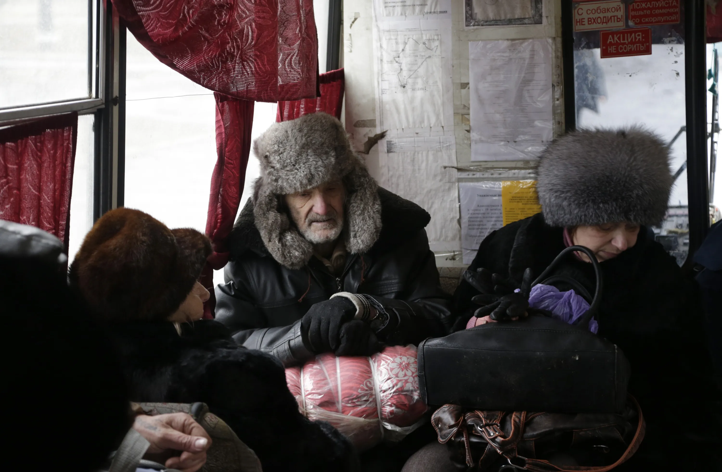 People wait on a bus to leave the town of Debaltseve in Artemivsk, Ukraine, Tuesday, February 3, 2015. Since the unrest in eastern Ukraine surged anew in early January, the separatists have made notable strides in clawing territory away from the government in Kiev. Their main offensive is now directed at Debaltseve – a government-held railway junction once populated by 25,000 people that lies between the rebel-held cities of Luhansk and Donetsk. Almost 2,000 residents have fled in the last few days alone. (Photo by Petr David Josek/AP Photo)