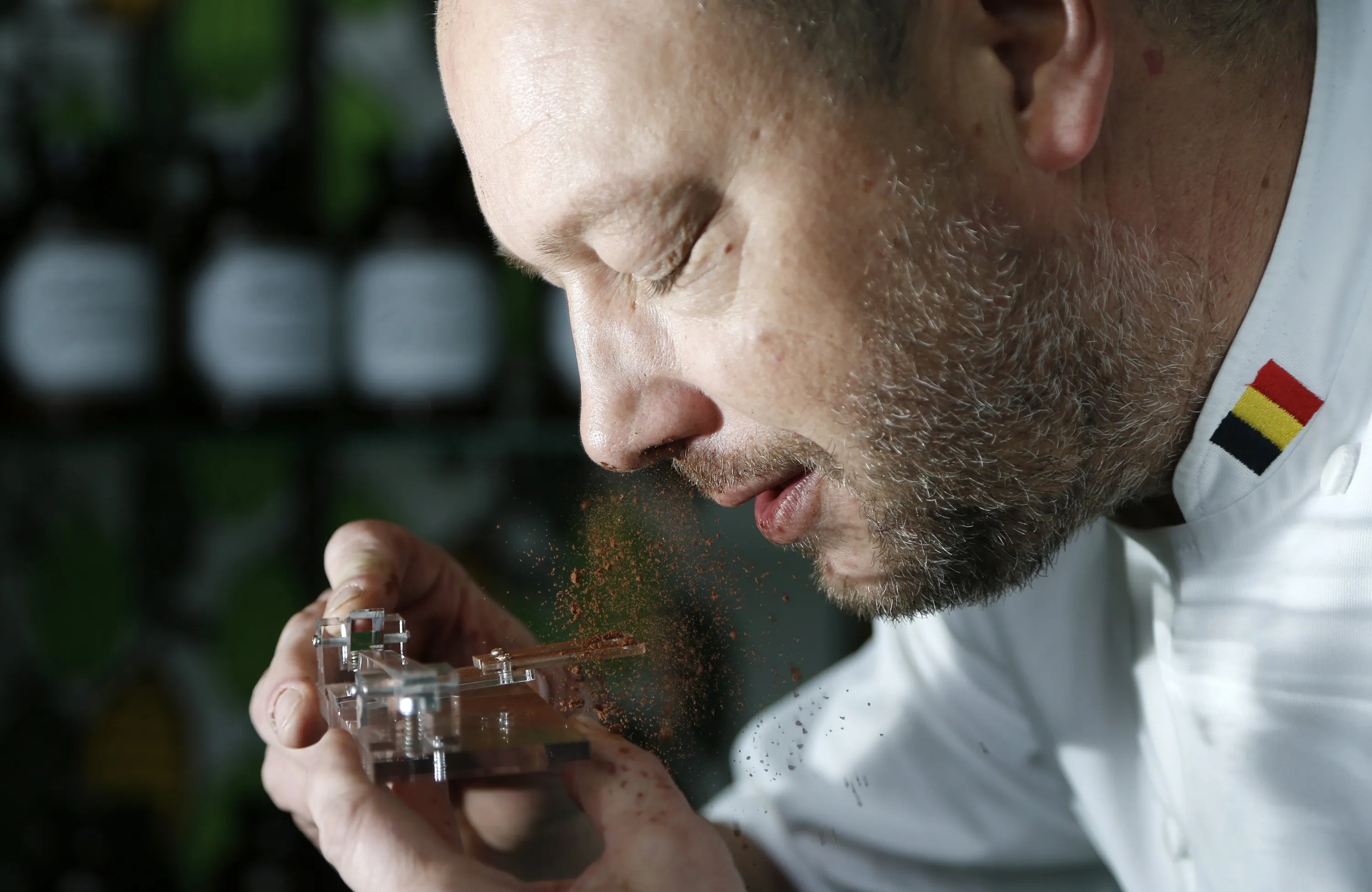 Belgian chocolatier Dominique Persoone snorts cocoa powder off his Chocolate Shooter in his factory in Bruges, February 3, 2015. (Photo by Francois Lenoir/Reuters)