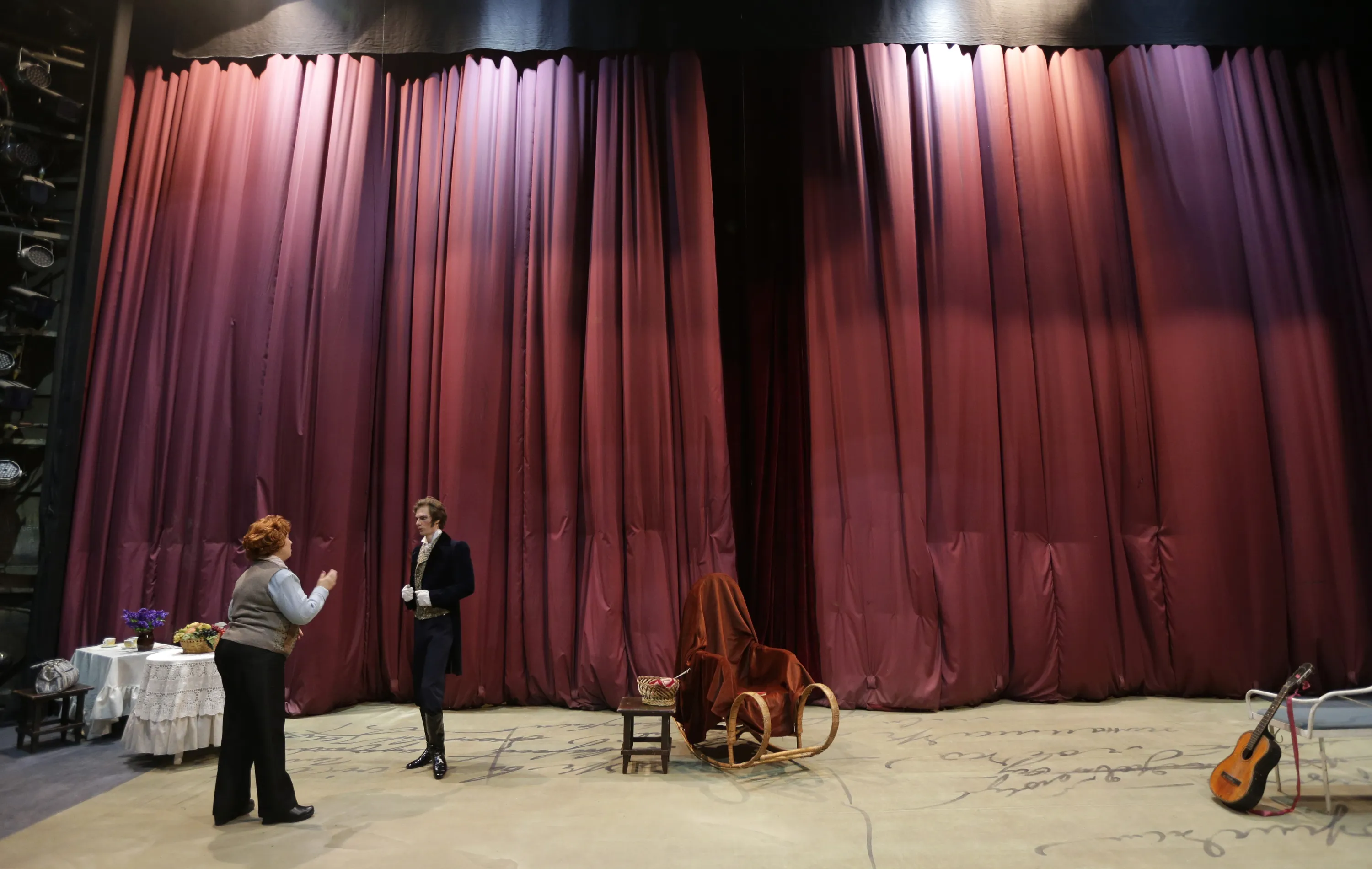 Artyom Yaroshevich, right, prepares to perform the title role in Eugene Onegin at the Donbass Opera Theatre in Donetsk, Ukraine, Saturday, February 7, 2015. (Photo by Petr David Josek/AP Photo)