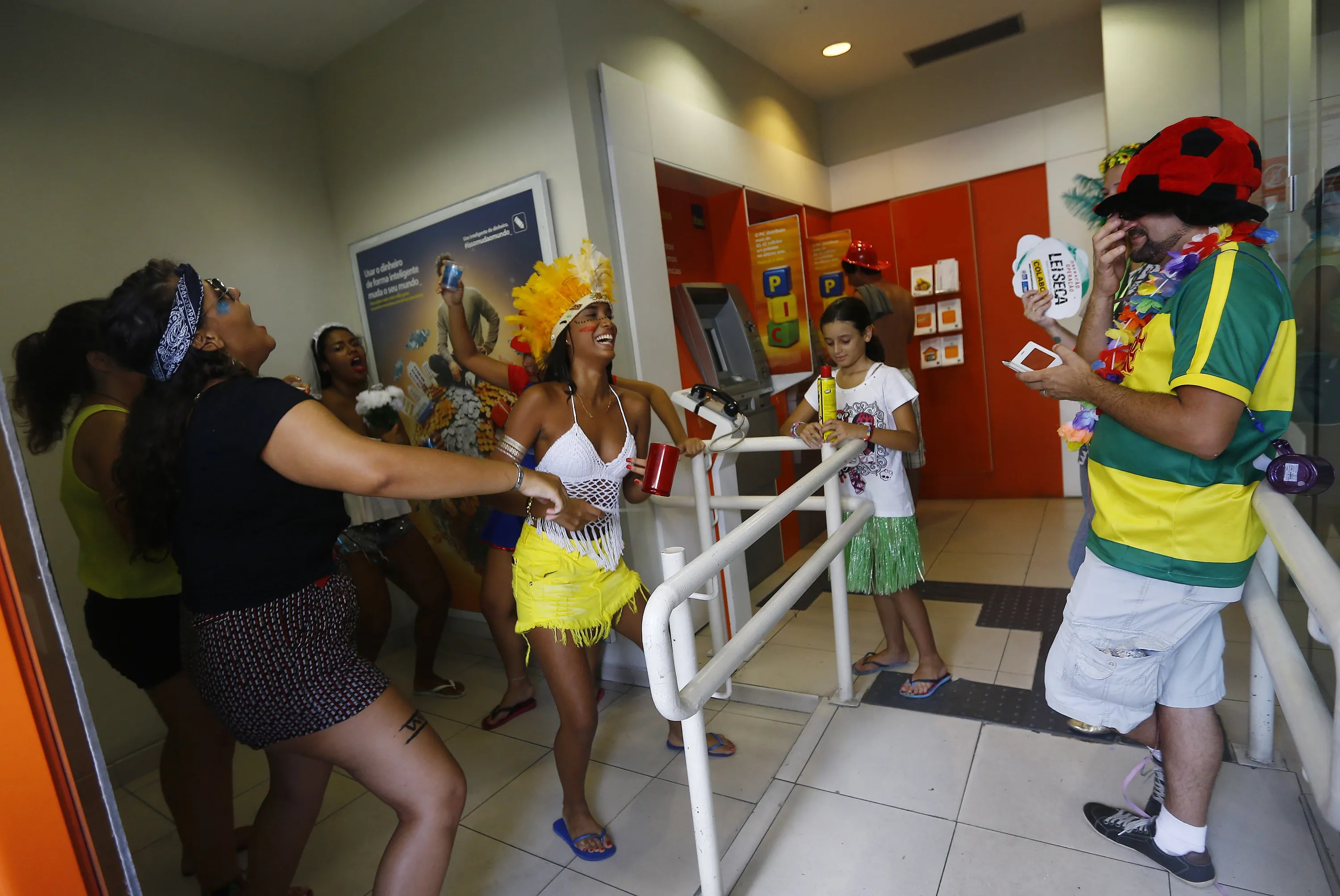 Revellers dance inside a bank during the annual block party known as the “Suvaco do Cristo” (Armpit of Christ), one of the many pre-carnival parties to take place in the neighbourhoods of Rio de Janeiro, February 8, 2015. (Photo by Ricardo Moraes/Reuters)