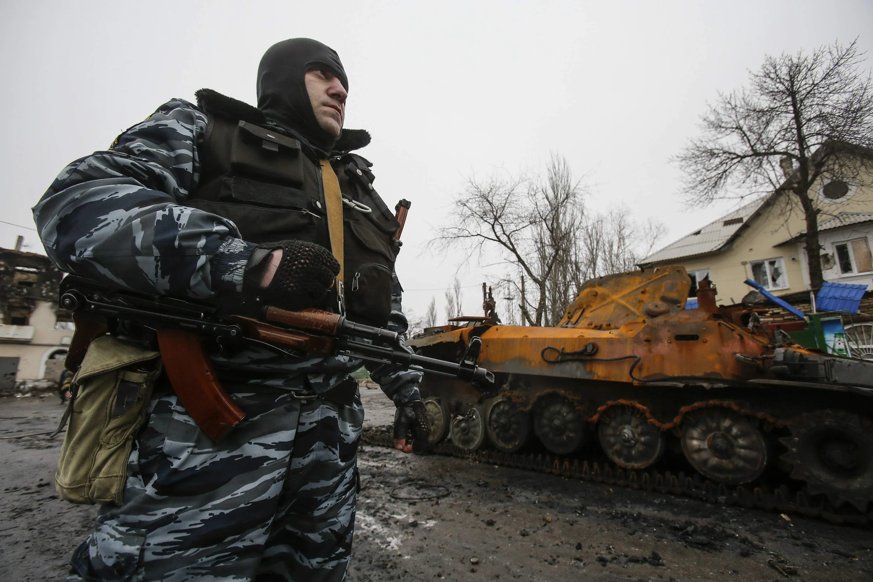 Member of the police of the separatist self-proclaimed Donetsk People's Republic stands near a burnt-out armoured vehicle in Vuhlehirsk, Donetsk region February 6, 2015. (Photo by Maxim Shemetov/Reuters)