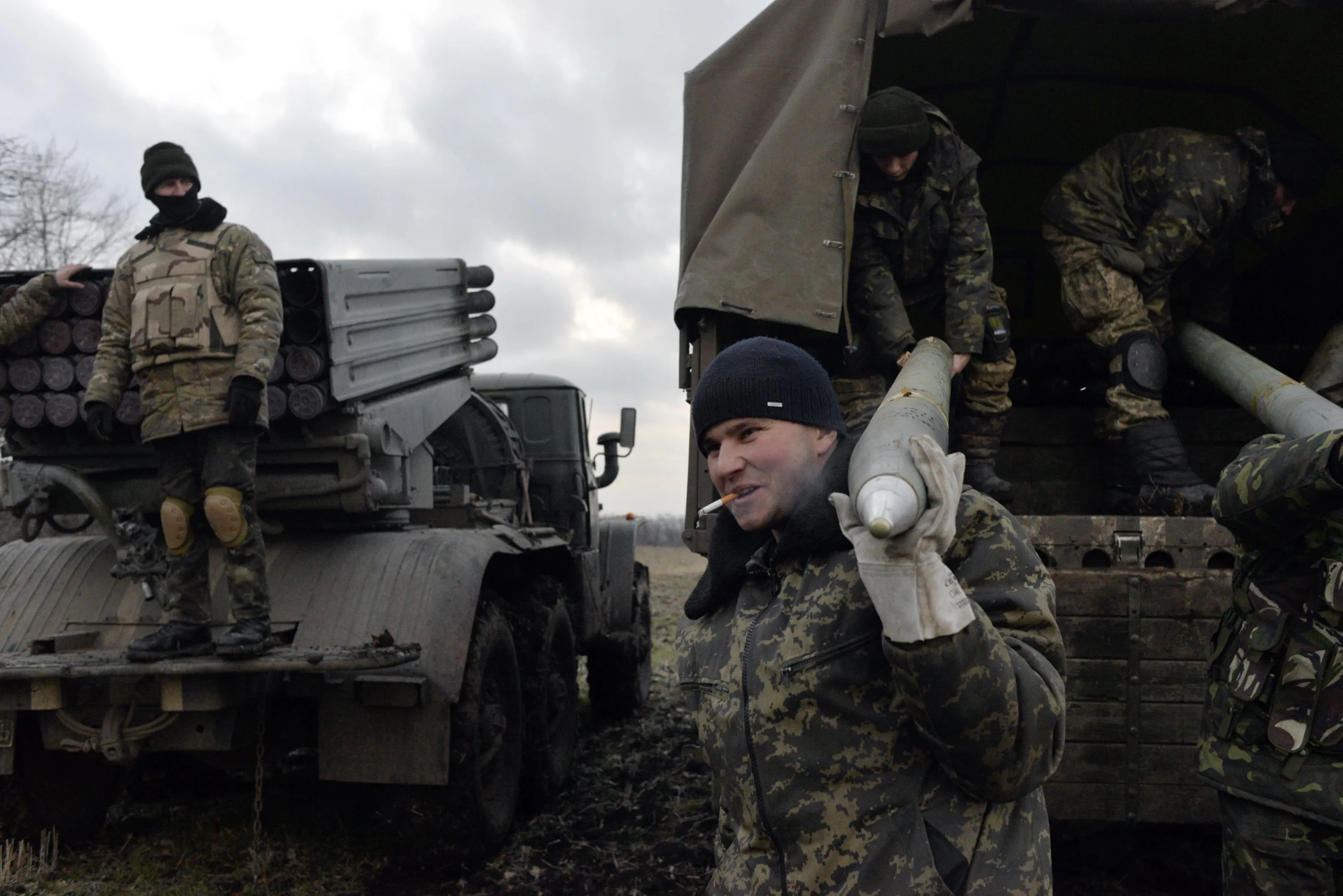 Ukrainian servicemen unload Grad rockets from a truck before launching them towards pro-Russian separatist forces outside Debaltseve, eastern Ukraine February 8, 2015. (Photo by Alexei Chernyshev/Reuters)