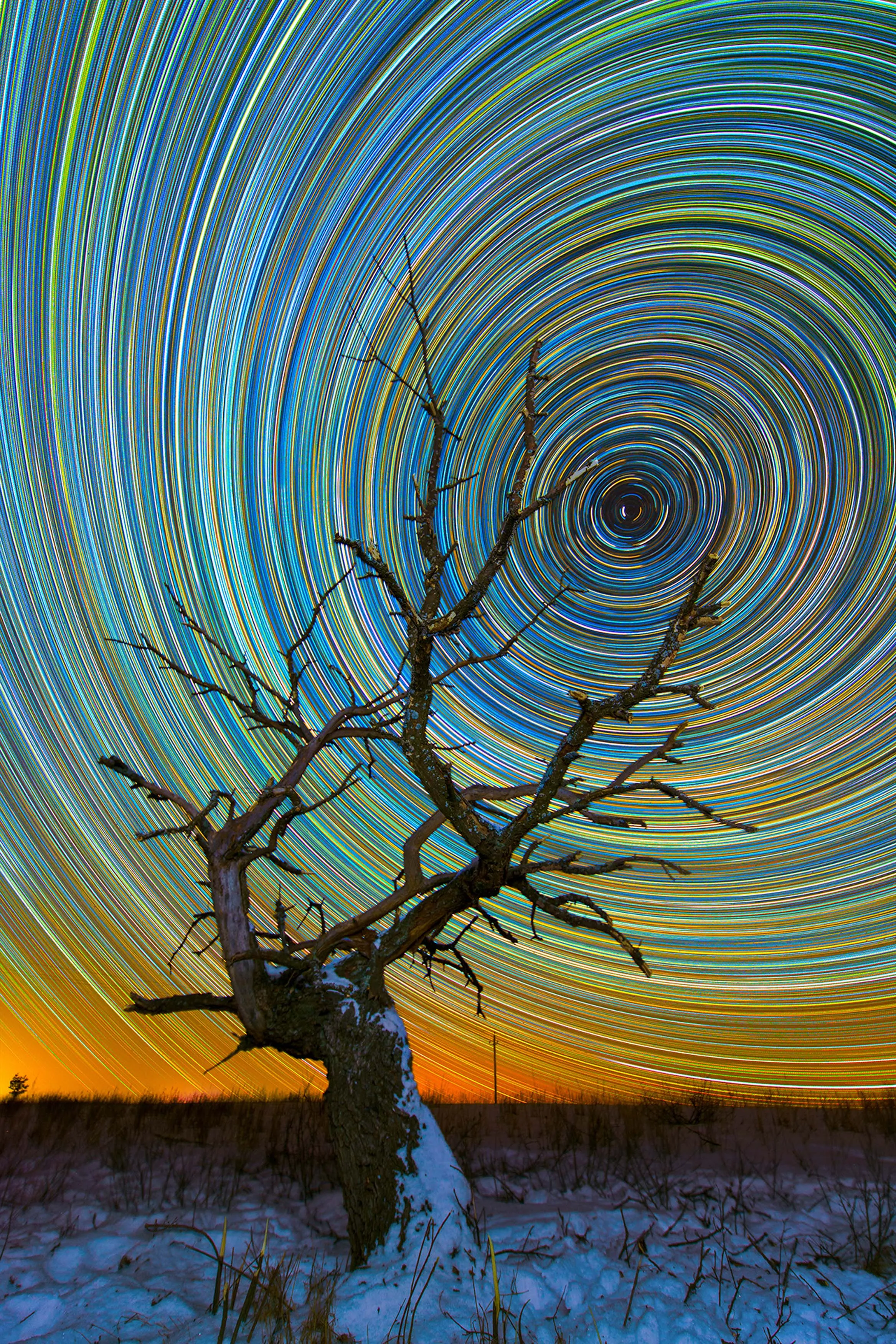 Vibrate, colorful star trails over a snowy field. (Photo by Evgeniy Zaytsev/Caters News)