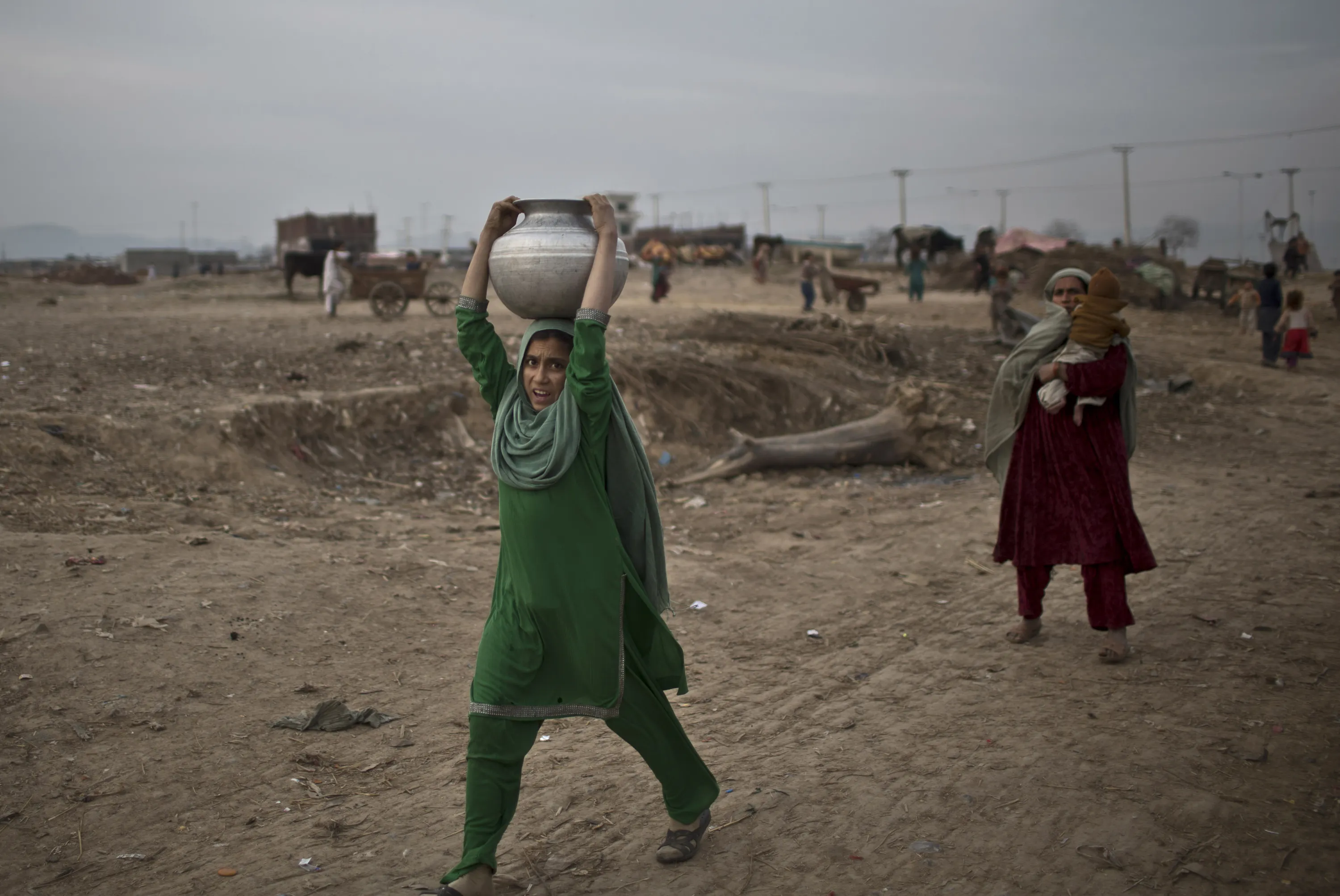An Afghan refugee girl walks back to her family's mud home carrying water on her head in a slum on the outskirts of Islamabad, Pakistan, Friday, February 6, 2015. (Photo by Muhammed Muheisen/AP Photo)