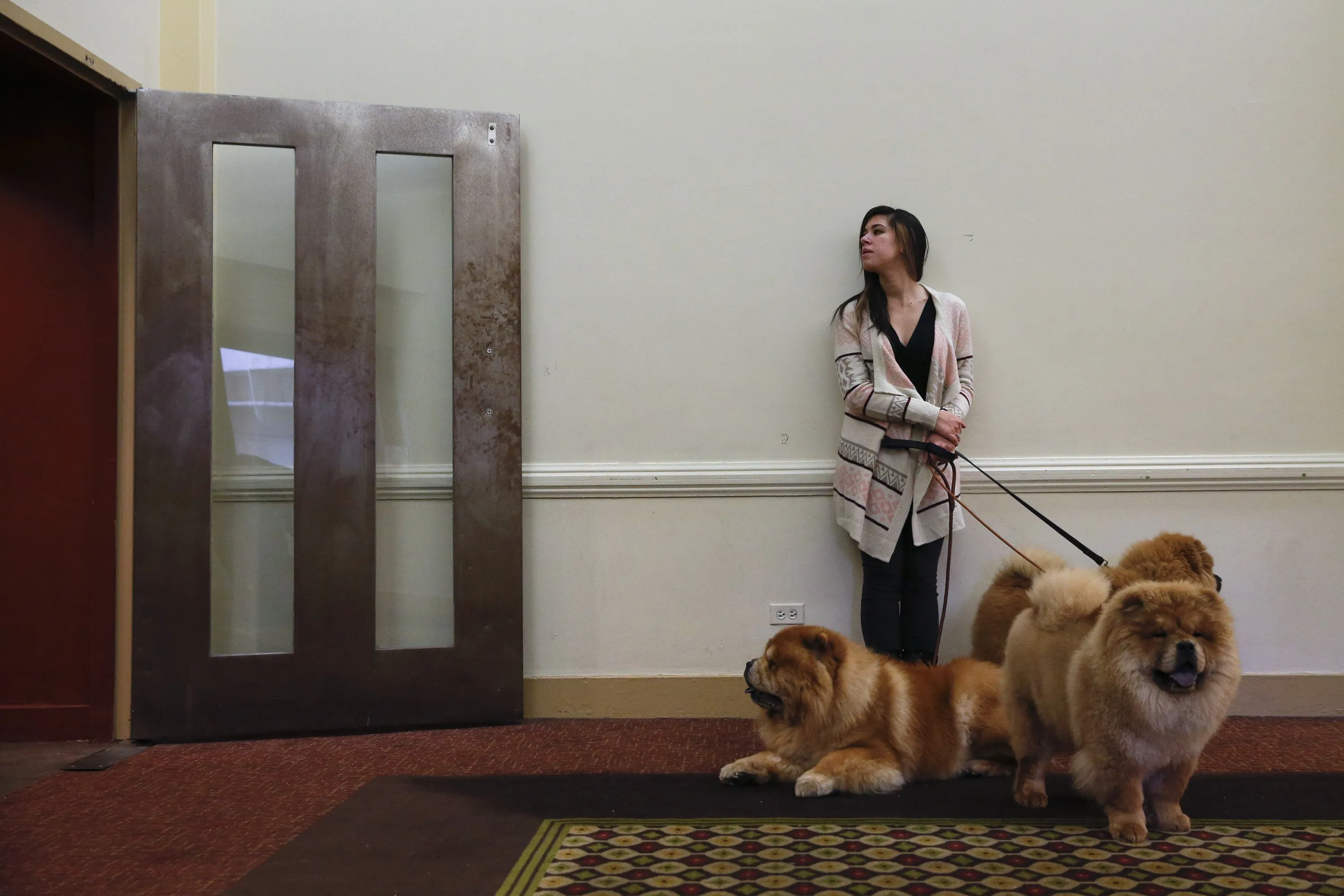 Dog handler Porscha Flores stands next to Chow Chow dogs before a news conference for the upcoming 139th Annual Westminster Kennel Club Dog Show in New York February 12, 2015. (Photo by Shannon Stapleton/Reuters)