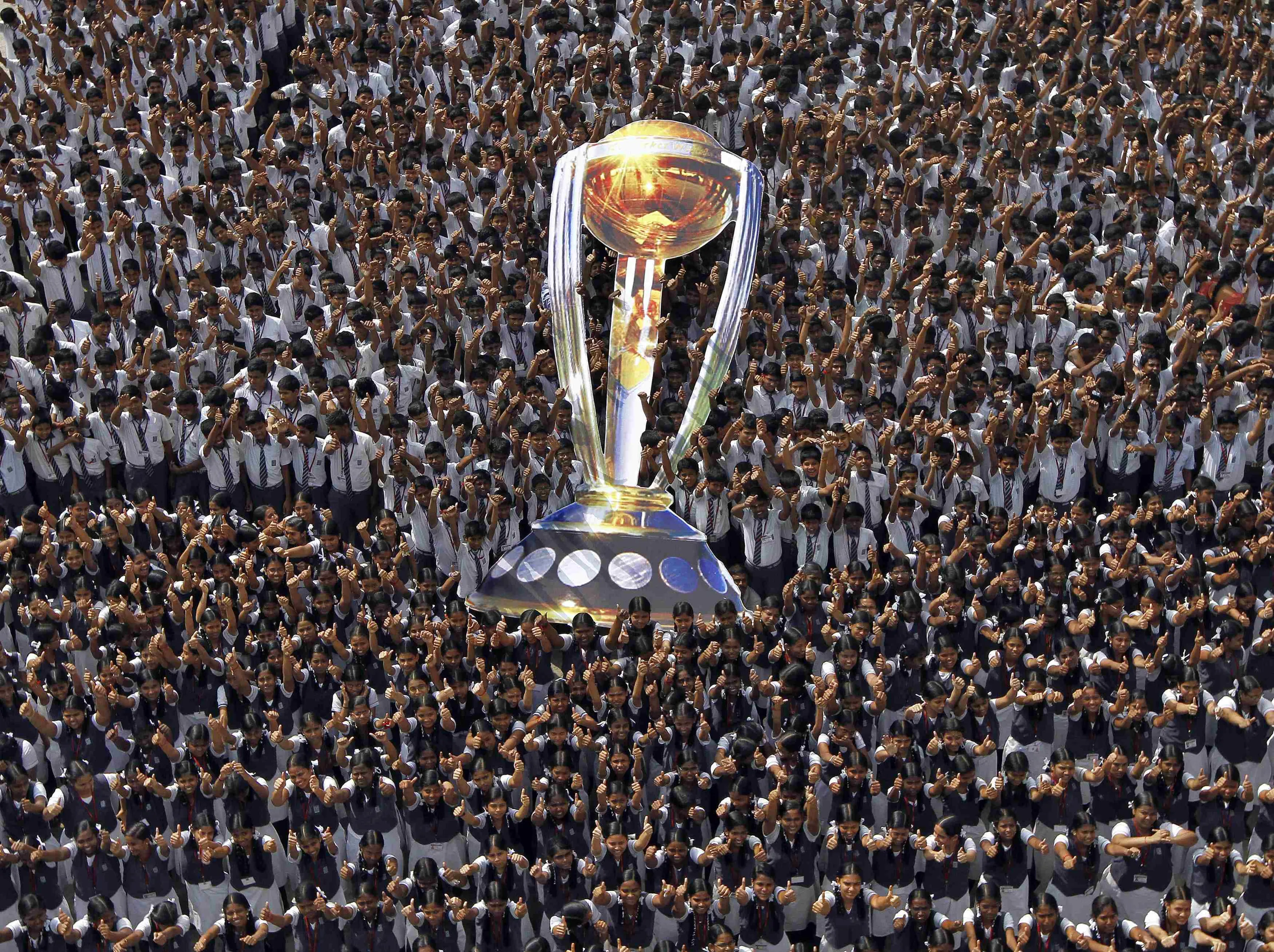 Students give thumbs-up to wish the Indian cricket team luck, as they hold a giant cut-out replica of the Cricket World Cup trophy, at a school in the southern Indian city of Chennai, February 12, 2015. (Photo by Reuters/Stringer)