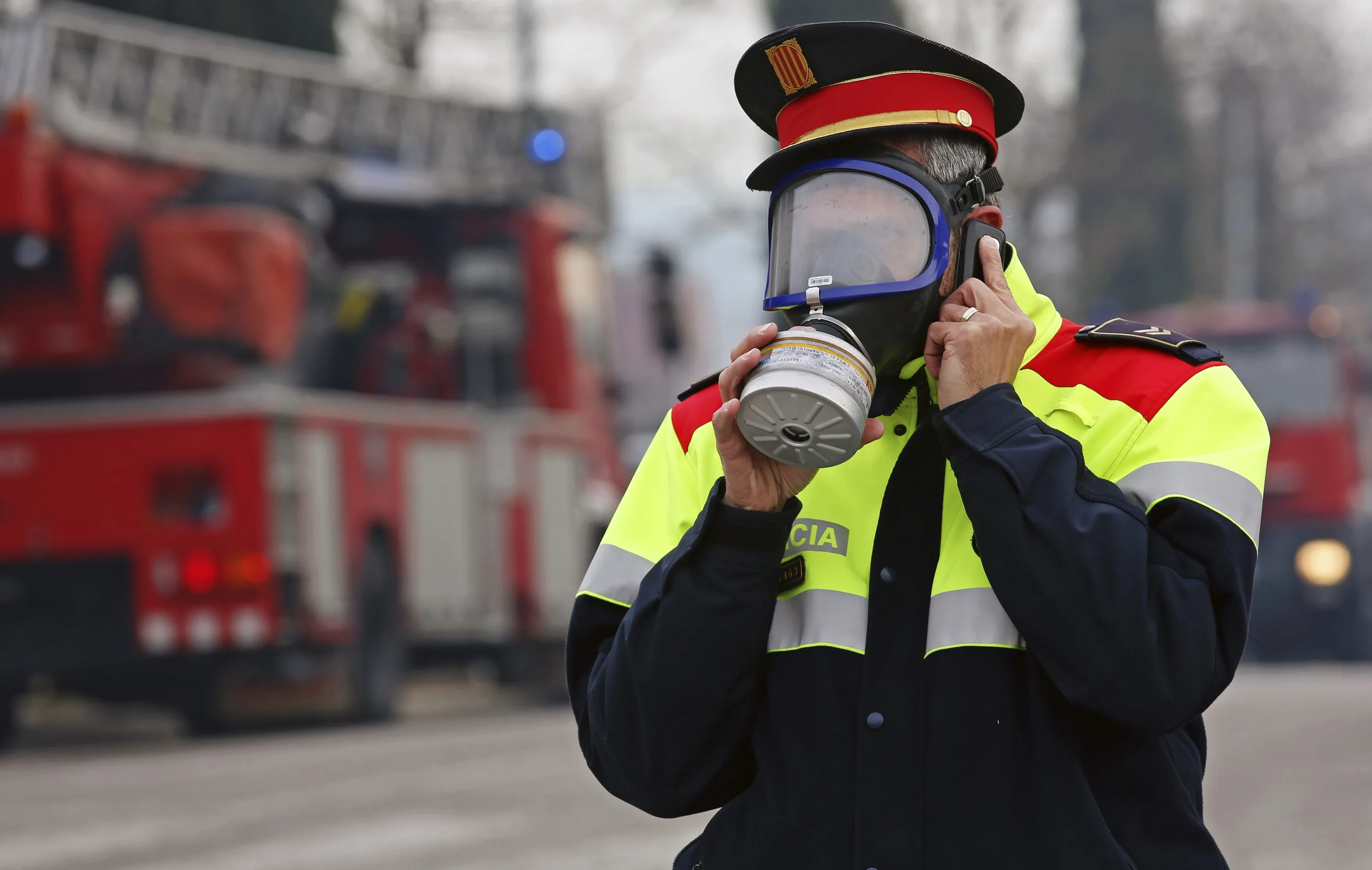 A Catalan “Mosso d'Esquadra” police officer wearing a gas mask speaks on a mobile phone after an explosion at a chemical plant caused a toxic cloud to spread over Igualada near Barcelona February 12, 2015. (Photo by Reuters/Stringer)