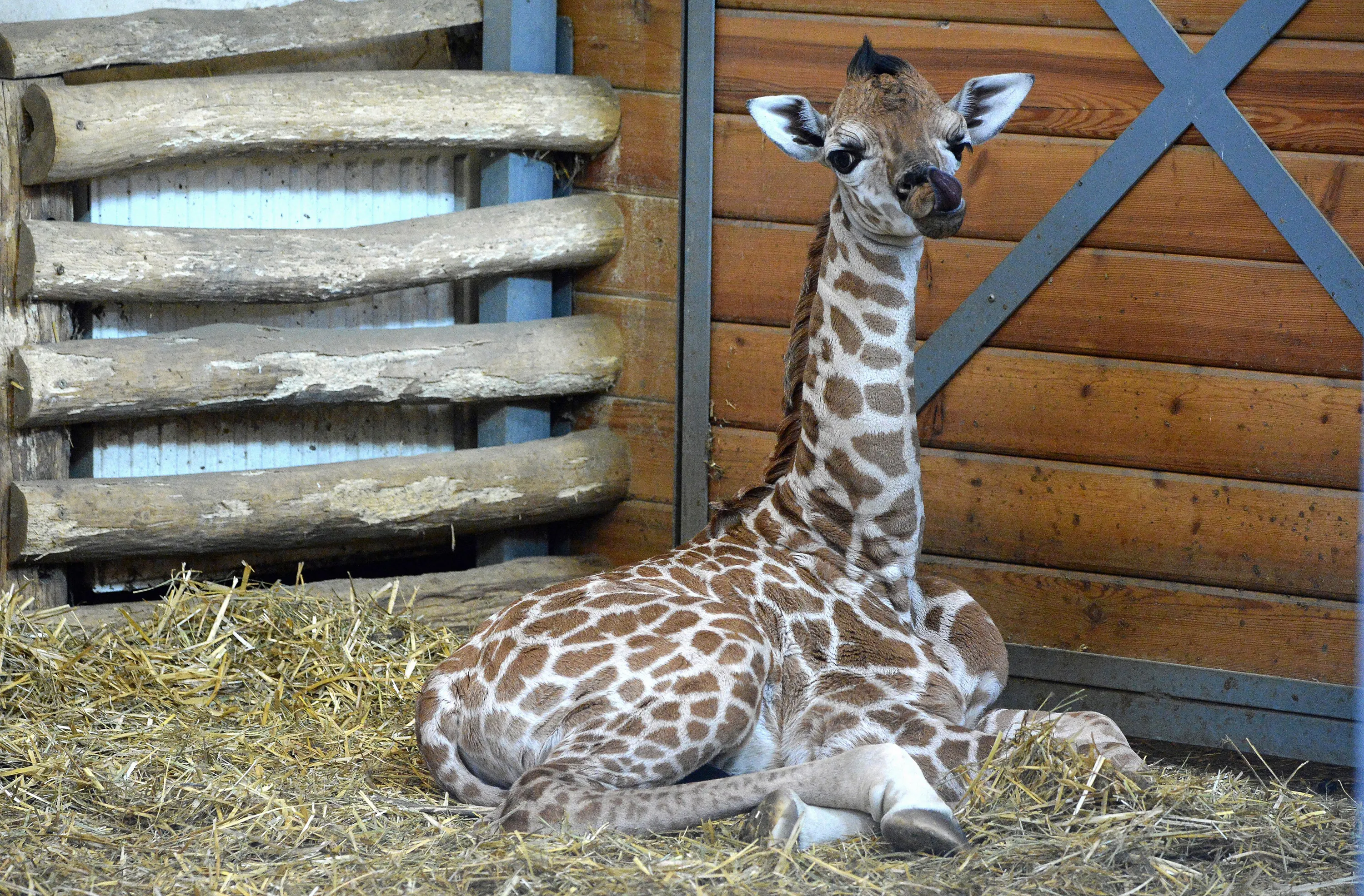 A six-days young baby giraffe Ikinya is pictured at the “Giraffe House” in the Zoo and Botanic Garden of Budapest on February 6, 2015. The new born animal was born on January 31 by his seven-year old mother Ingrid from Prague zoo. (Photo by Attila Kisbenedek/AFP Photo)