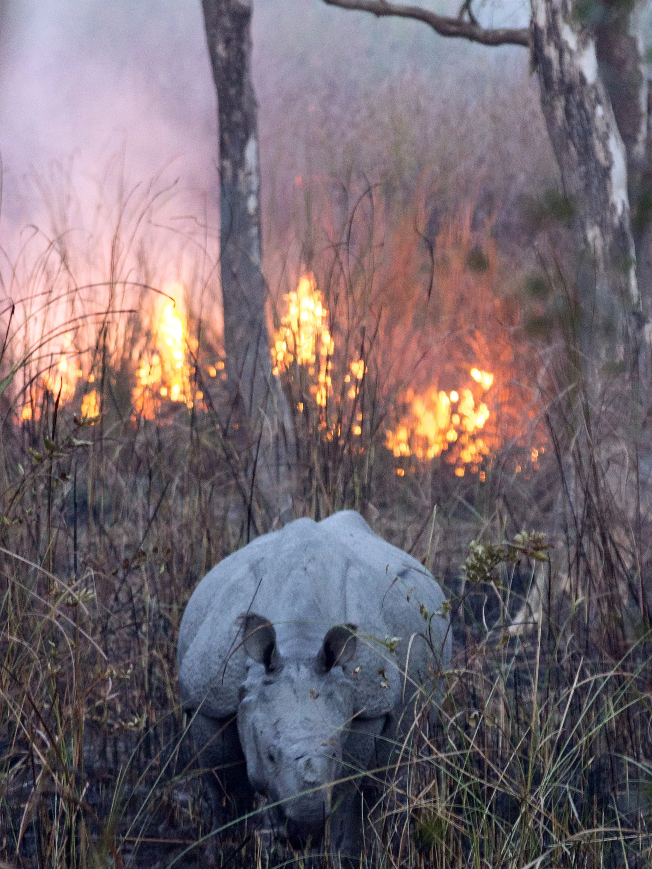 A one-horned rhinoceros is pictured as a controlled burn of grassland is seen at Kaziranga National Park in India's northeastern Assam state on February 8, 2015. (Photo by AFP Photo/Stringer)