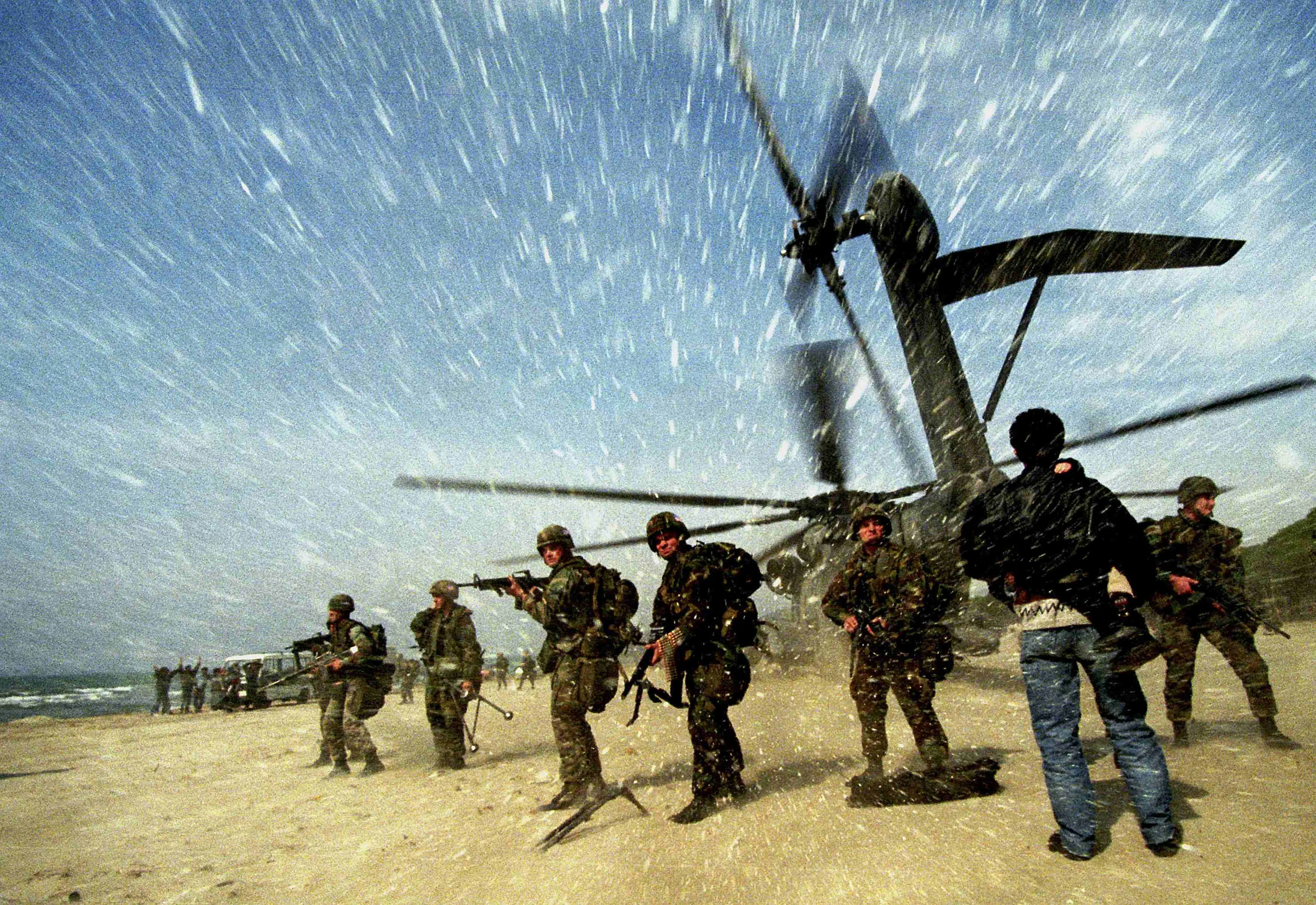 An Albanian man carries a child to a US Marine CH53 Super Stallion helicopter as it lands at Golame beach near the port of Durres, in this March 16, 1997 file picture. Yannis Behrakis: I was covering the unrest in Albania following the pyramid scheme failures. Albanian civilians had lost $1.2 billion and Albania descended into civil disorder and violence. The government was toppled and 2,000 people were killed. My late colleague Kurt Schork and I were the only members of the press staying in a hotel where the armed owner protected us from bandits who would rob every journalist who dared to come alone to cover the story. The owner insisted on placing Kalashnikovs and hand grenades in the closets of our rooms “to protect ourselves if needed”, as he said. On March 16 we drove to Golame beach where two U.S. helicopters had landed, kicking off a blizzard of sand as hundreds of desperate Albanians gathered in the area, hoping to get a lift out of the country. Blinded by the sand I shot a few pictures when an Albanian man holding his child ran towards the helicopter. About a dozen U.S. Marines jumped off the Super Stallion and pointed their M-16 assault rifles at the Albanians. The man with the child was begging the soldiers to let him in onboard. The Marines were clearly surprised by the crowd and asked me what was going on, and if I saw any foreigners trying to leave. I explained that these people were just desperate and wanted to leave Albania, and that they thought the helicopters were there to take them to safety. The situation was getting out of control and a few warning shots were fired and people were beaten back with rifle butts. The fact that we decided to take the risk and stay in Durres paid off. Papers all over the world ran these pictures on their front pages. (Photo by Yannis Behrakis/Reuters)