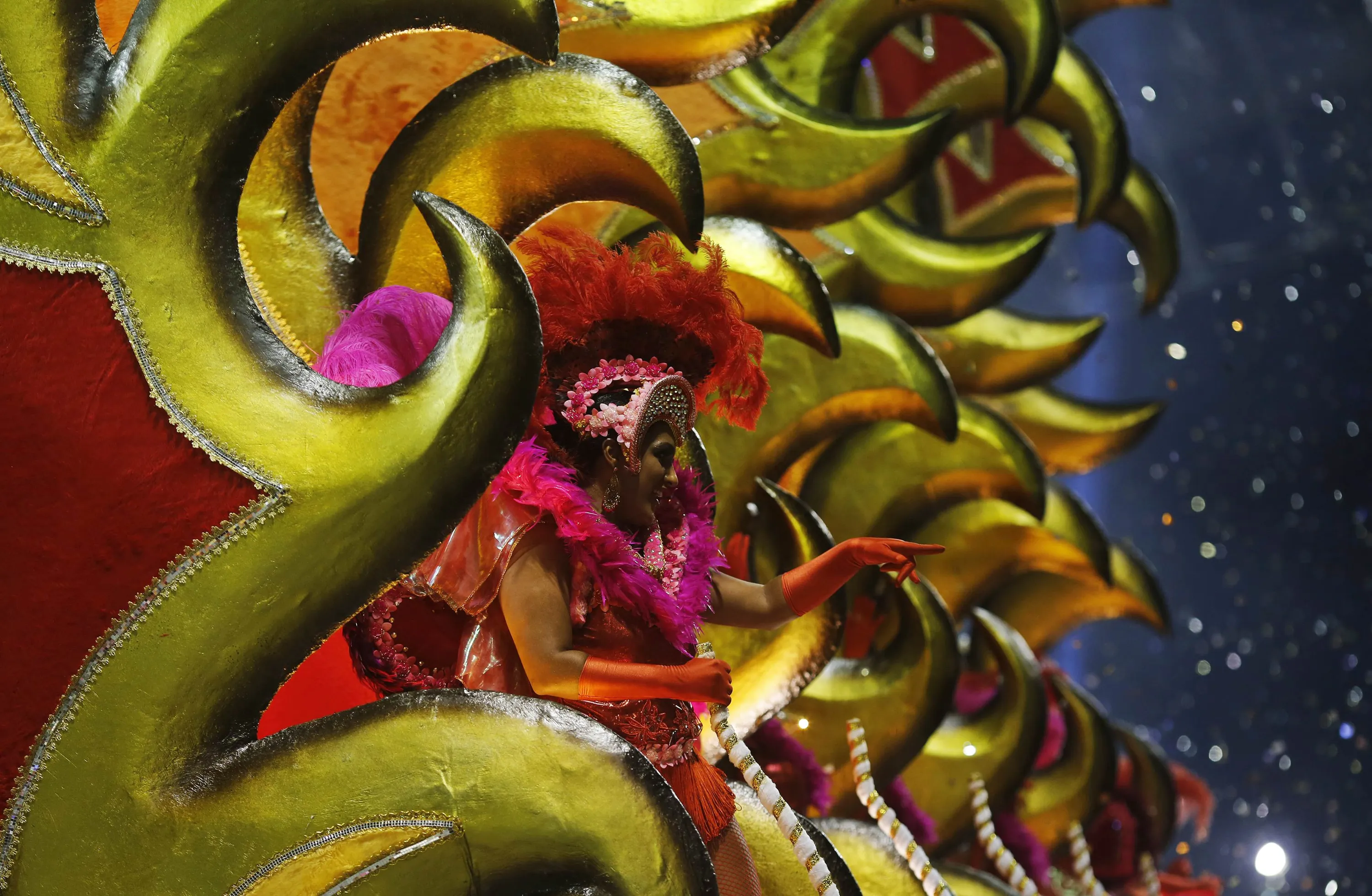 A reveller from the Rosas de Ouro Samba School takes part in a carnival at Anhembi Sambadrome in Sao Paulo February 14, 2015. (Photo by Nacho Doce/Reuters)