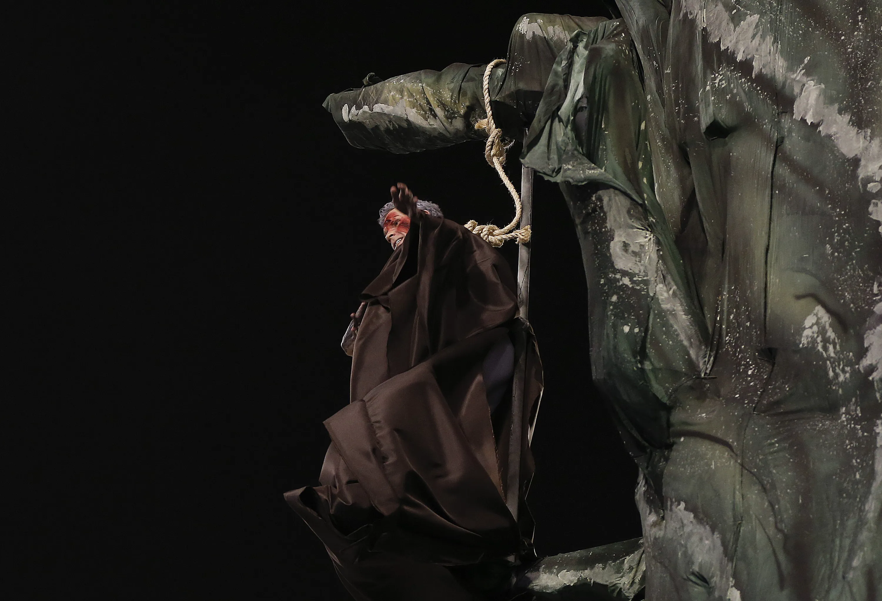 A dancer from the Tom Maior samba school performs on a float during the Carnival parade at the Sambodromo in Sao Paulo, Brazil, Friday, February 13, 2015. (Photo by Andre Penner/AP Photo)