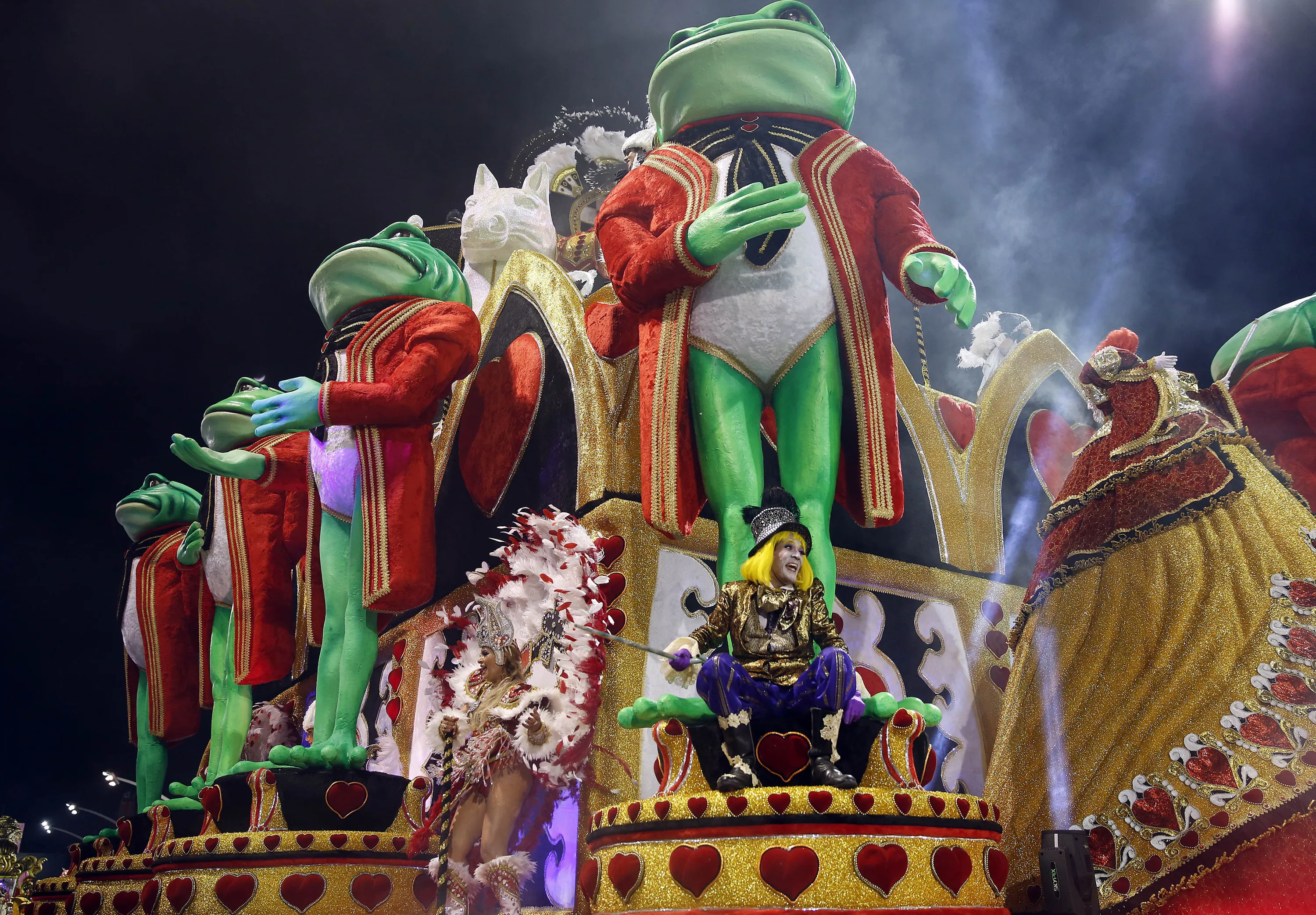 Dancers from the Rosas de Ouro samba school perform on a float during a carnival parade in Sao Paulo, Brazil, Saturday, February 14, 2015. (Photo by Andre Penner/AP Photo)
