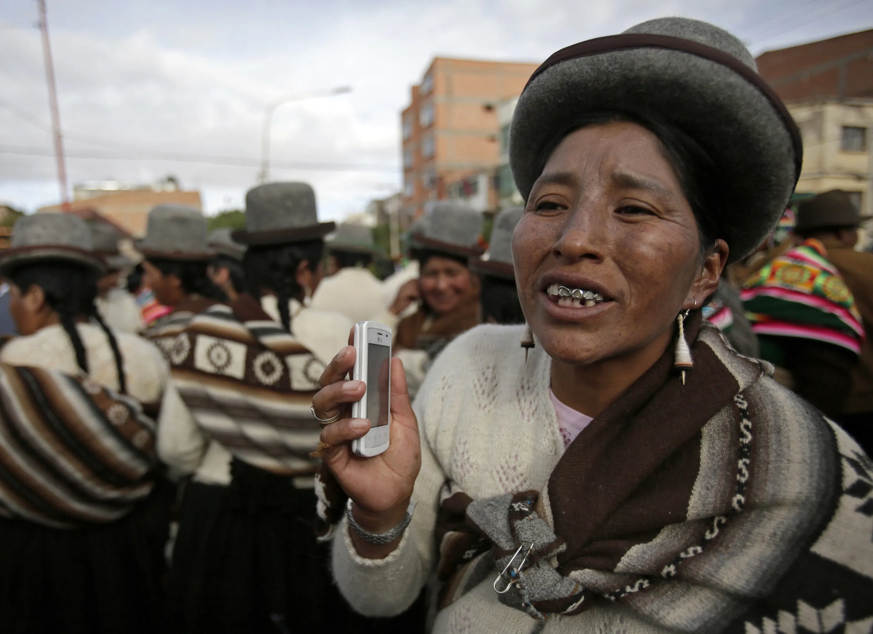 An indigenous woman holds a mobile phone during the Anata Andina (Andean carnival) parade in Oruro February 12, 2015. (Photo by David Mercado/Reuters)