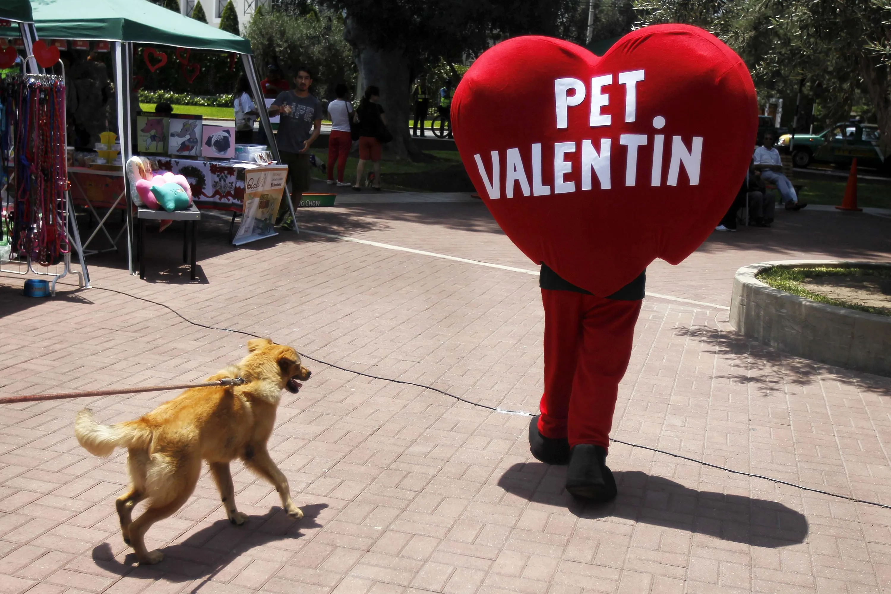 A dog tries to follow a man wearing a heart-shaped costume as they attend a symbolic pets wedding during Valentine's Day celebrations organized by a local municipality in Lima February 14, 2015. (Photo by Enrique Castro-Mendivil/Reuters)