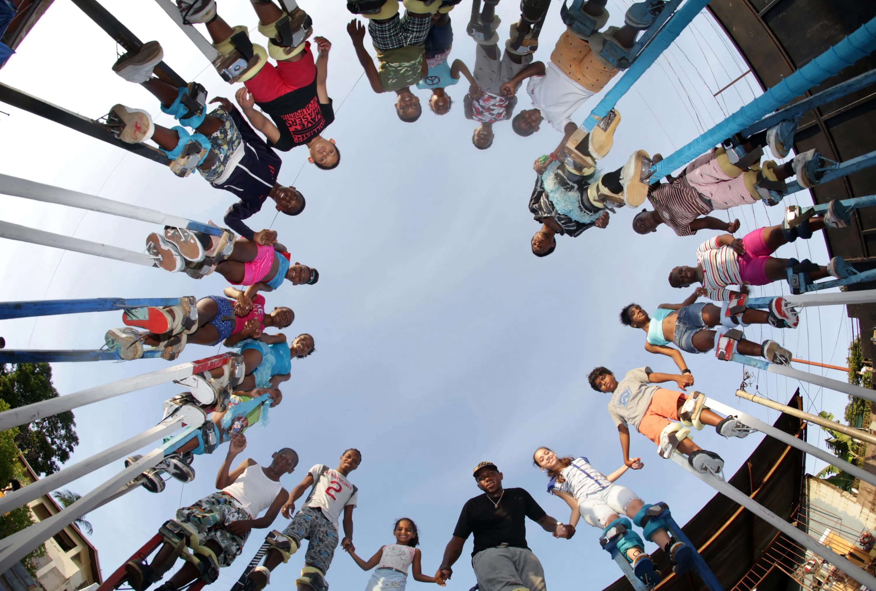 The members of the Keylemanjahro School of Art and Culture gather in a circle for a group photo at their base yard in Harding Place, Cocorite, just West of the capital Port-of-Spain, Trinidad, on February 8, 2015. (Photo by Andrea De Silva/Reuters)