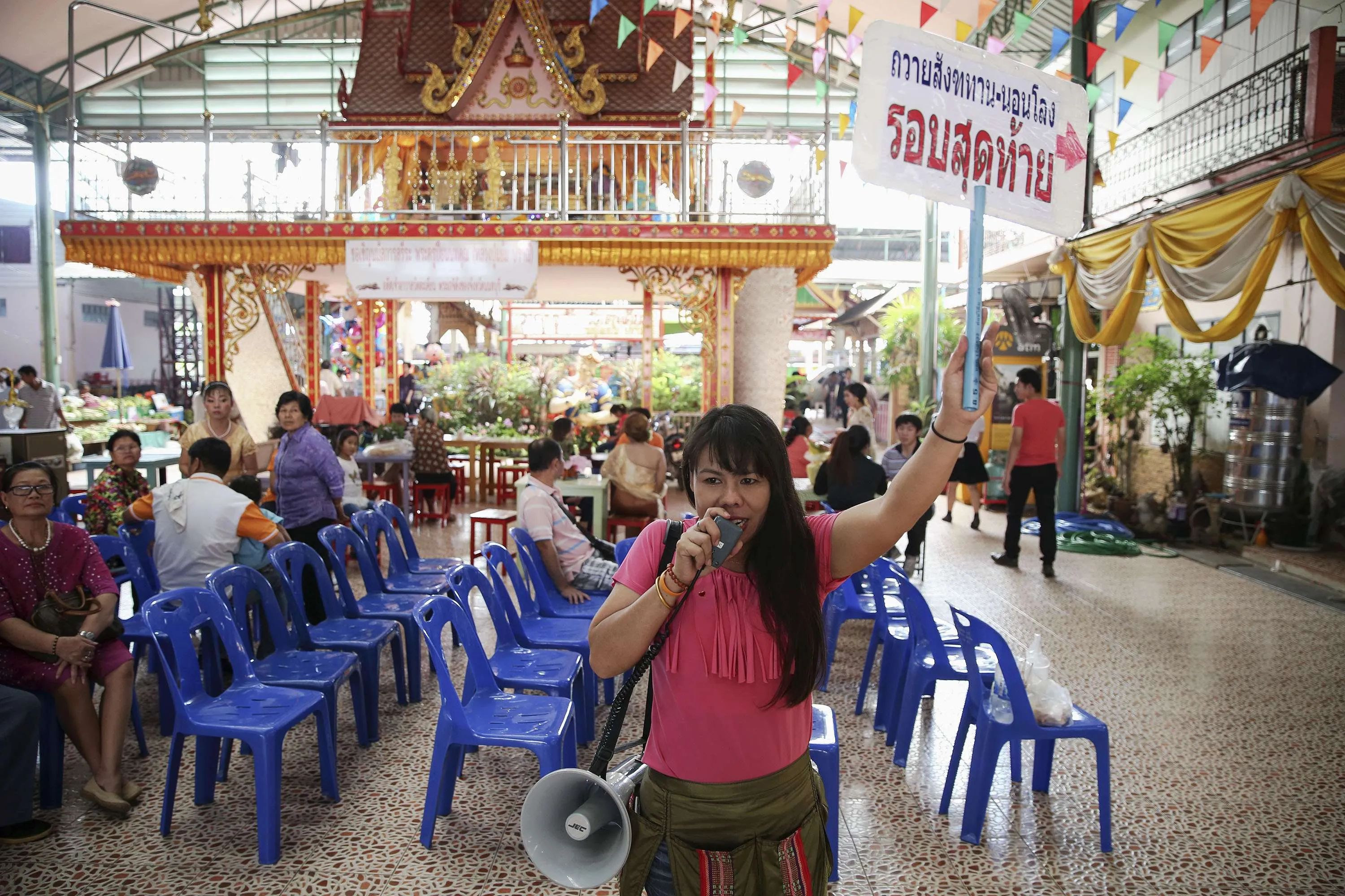 A woman holds a sign reading “Offering alms, sleeping in coffins, last round” as she invites people at Wat Takien temple in Nonthaburi province, on the outskirts of Bangkok February 14, 2015. (Photo by Damir Sagolj/Reuters)