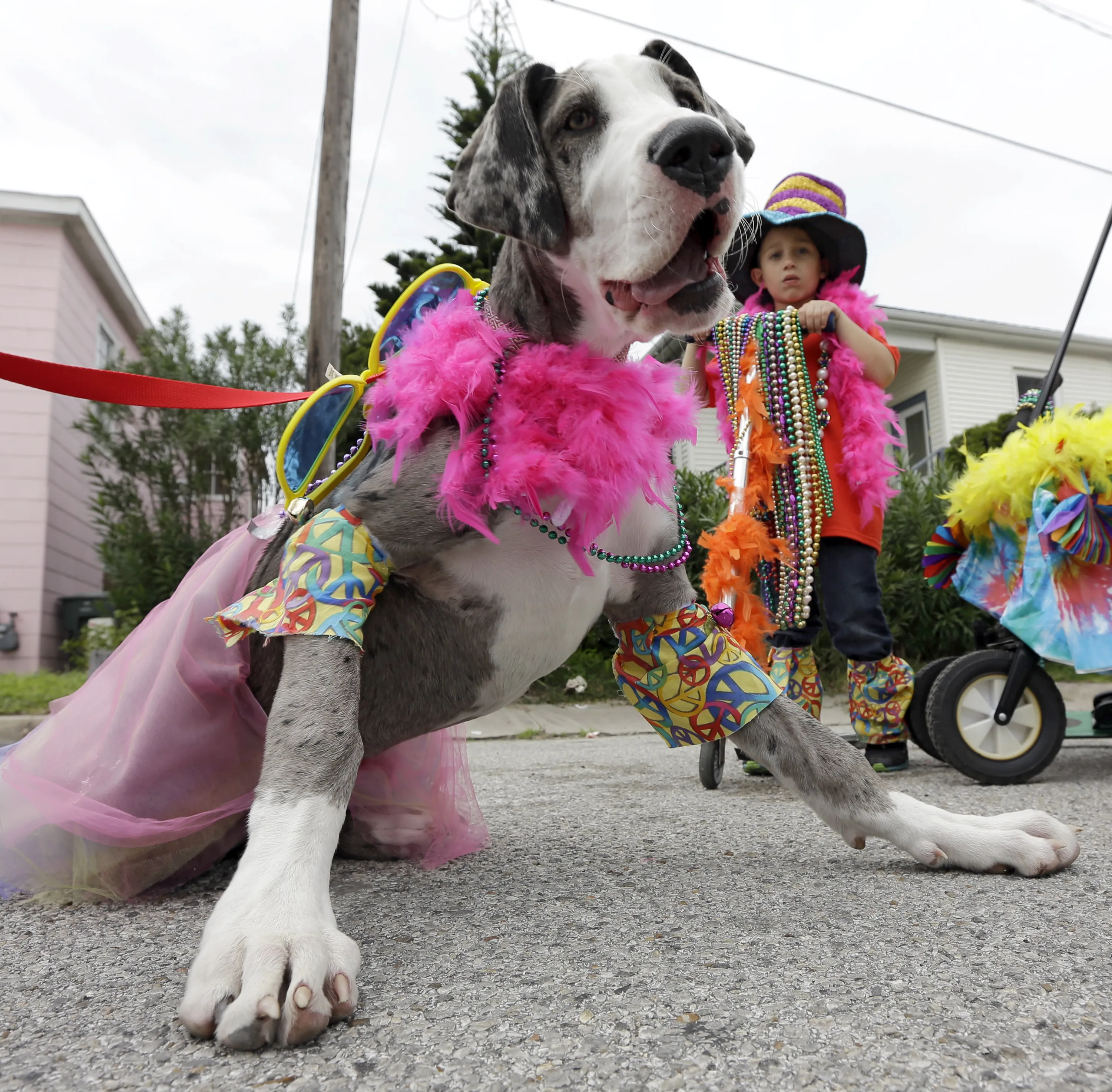 Diesel Del Bosque, right, waits with his dog Zoe for the start of the Krewe of Barkus and Meoux parade along the seawall in Galveston, Texas, Sunday, February 15, 2015. The parade is sponsored by the Galveston Island Humane Society as a way to involve family pets in the spirit of Mardi Gras. (Photo by David J. Phillip/AP Photo)