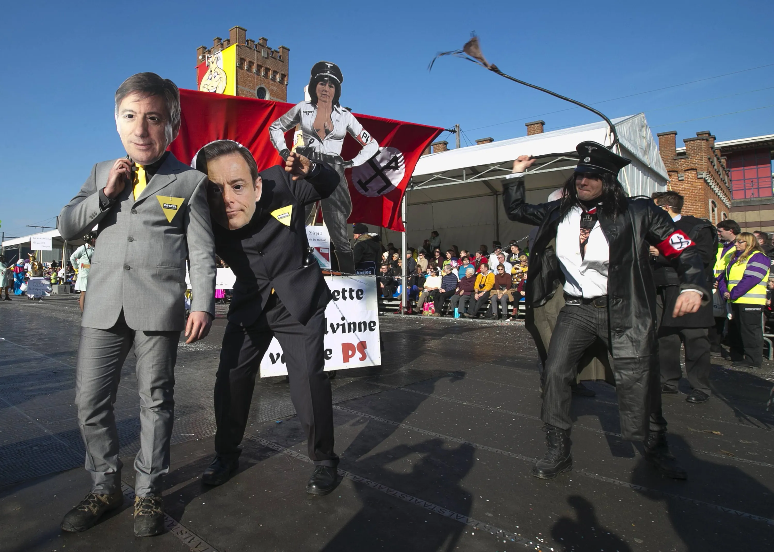 Revellers dressed as Belgian politicians Jan Jambon (L) and Bart De Wever (C) of the Flemish right-wing party (N-VA) take part in the 87th carnival parade of Aalst February 15, 2015. (Photo by Yves Herman/Reuters)