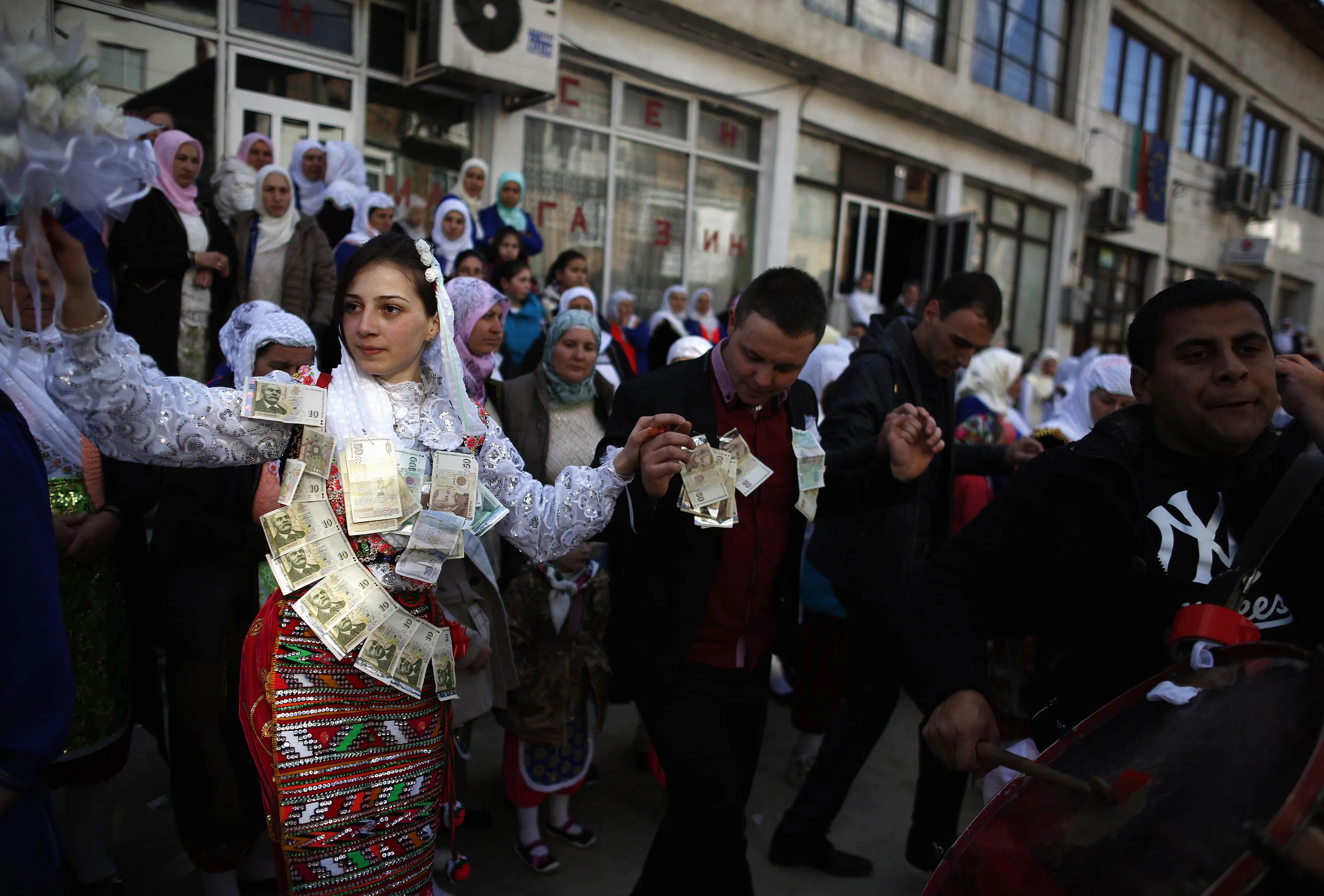 Bulgarian Muslims bride Fikrie Bindzheva (L) dances next to her groom Azim Liumankov during their wedding ceremony in the village of Ribnovo, in the Rhodope Mountains, February 15, 2015. (Photo by Stoyan Nenov/Reuters)