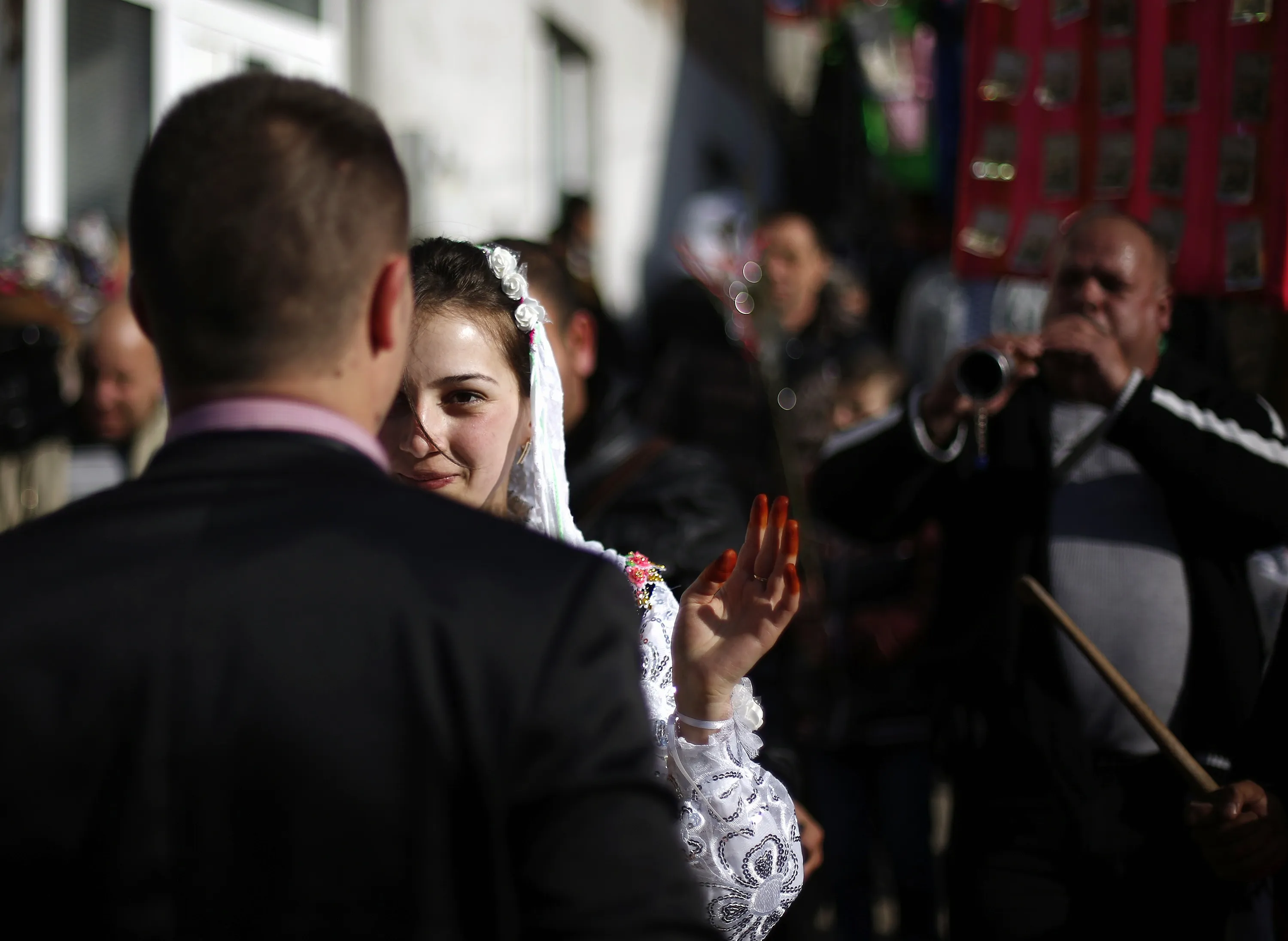 Bulgarian Muslims bride Fikrie Bindzheva dances next to her groom Azim Liumankov during their wedding ceremony in the village of Ribnovo, in the Rhodope Mountains, February 15, 2015. (Photo by Stoyan Nenov/Reuters)