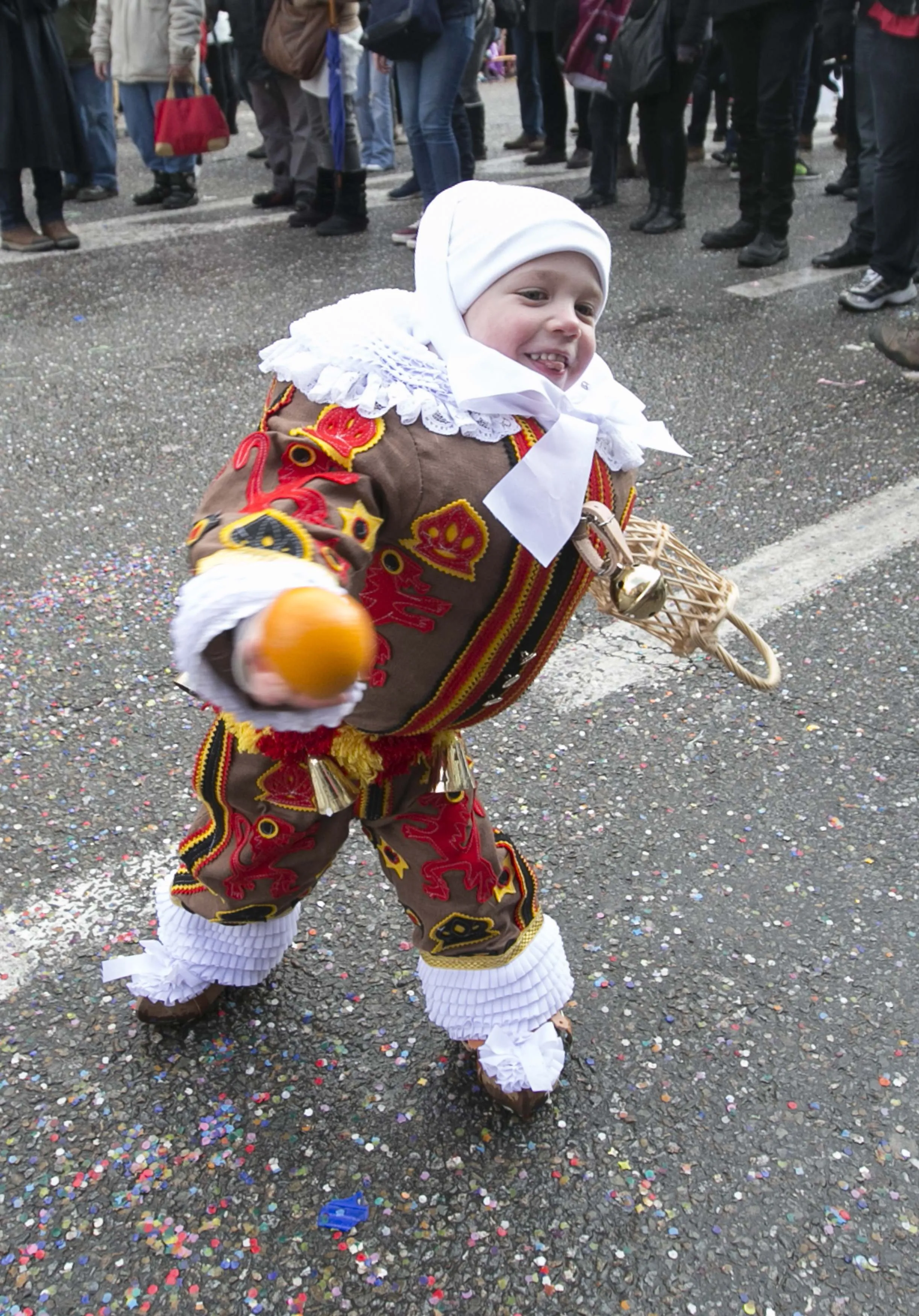 Hugo Belleri, a three-year-old boy and the youngest Gilles of Binche, throws an orange while taking part in the parade during the carnival event in Binche February 17, 2015. (Photo by Yves Herman/Reuters)