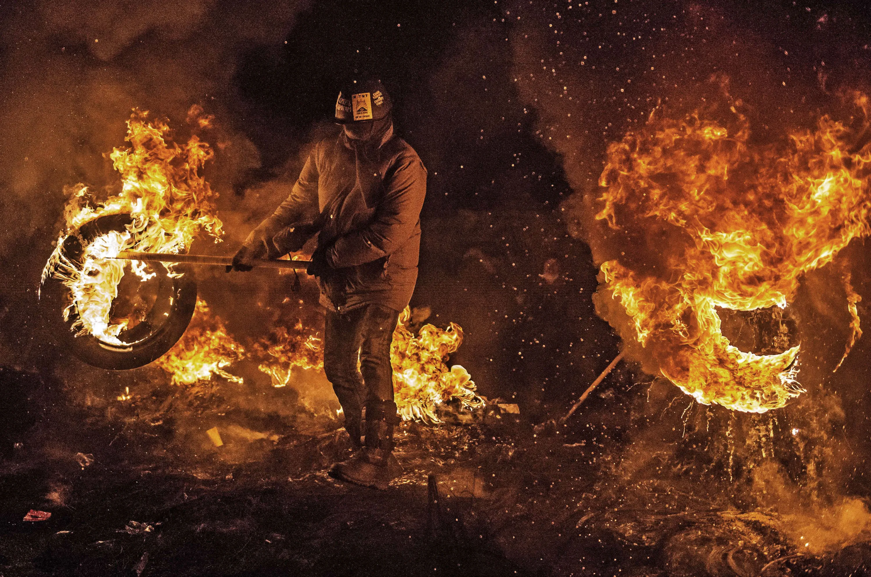 Activists of Euromaidan burn tires and warm themselves at a barricade in the center of Kiev early on January 24, 2014. Crunch talks between the opposition and President Viktor Yanukovych failed Thursday to end Ukraine's crisis but an uneasy truce held after five days of deadly clashes between protesters and security forces. (Photo by Sergei Supinsky/AFP Photo)