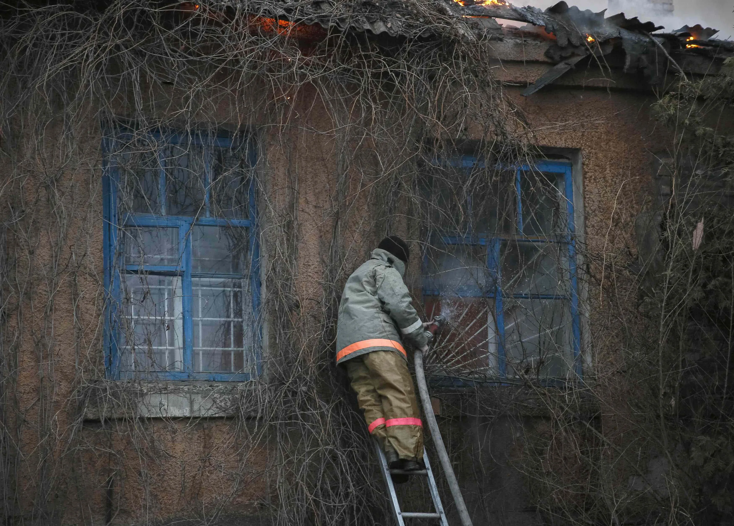 A firefighter extinguishes a building after shelling in Artemivsk, estern Ukraine February 14, 2015. (Photo by Gleb Garanich/Reuters)