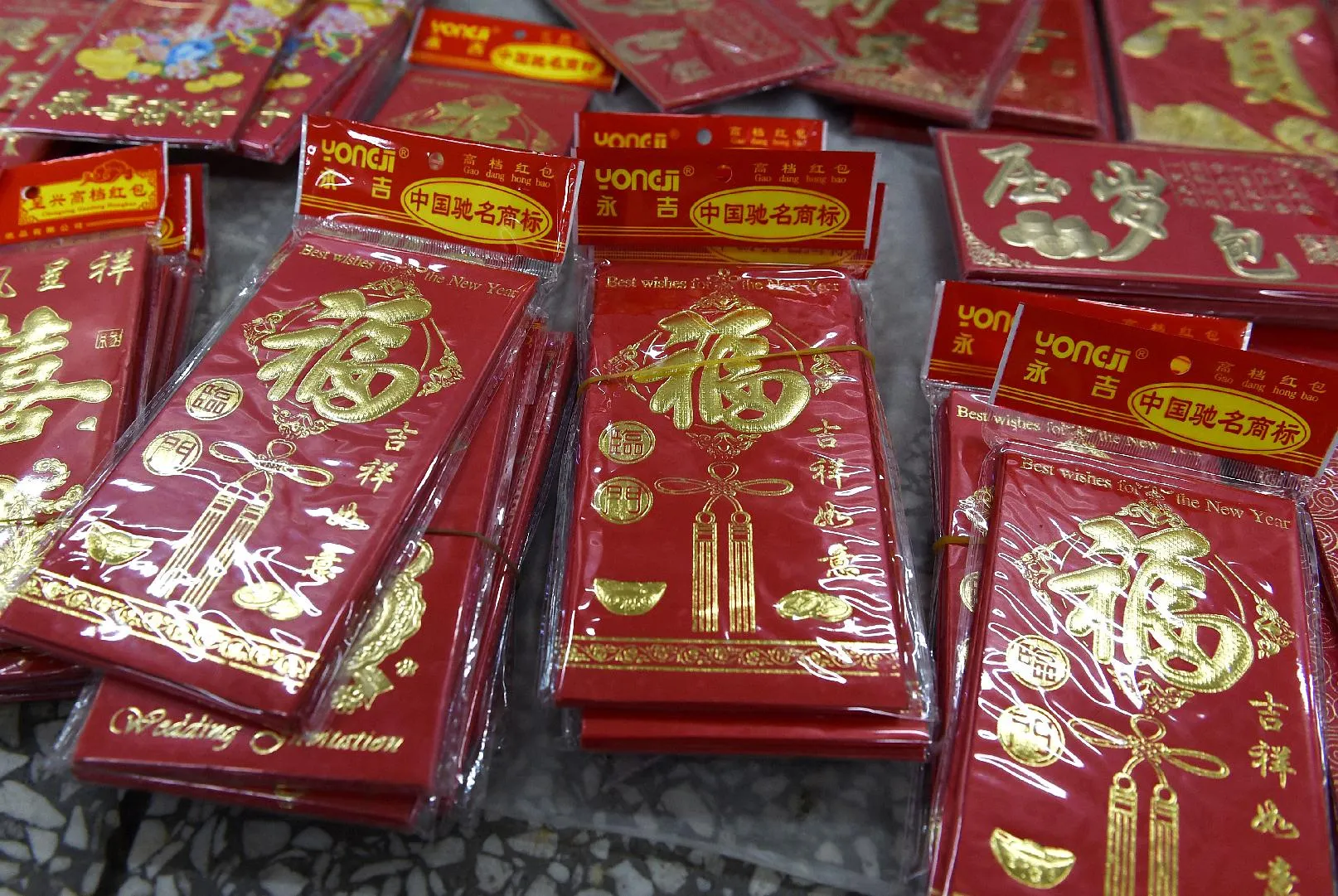 This photo taken on February 17, 2015 shows red “hongbao” packets for sale in a pedestrian underpass in Beijing. In China, the tradition of giving “hongbao”, or red envelopes, to celebrate the Lunar New Year is enjoying a resurgence in popularity online – a golden opportunity for Internet giants Tencent and Alibaba as they battle for the lucrative online payment market. (Photo by Greg Baker/AFP Photo)