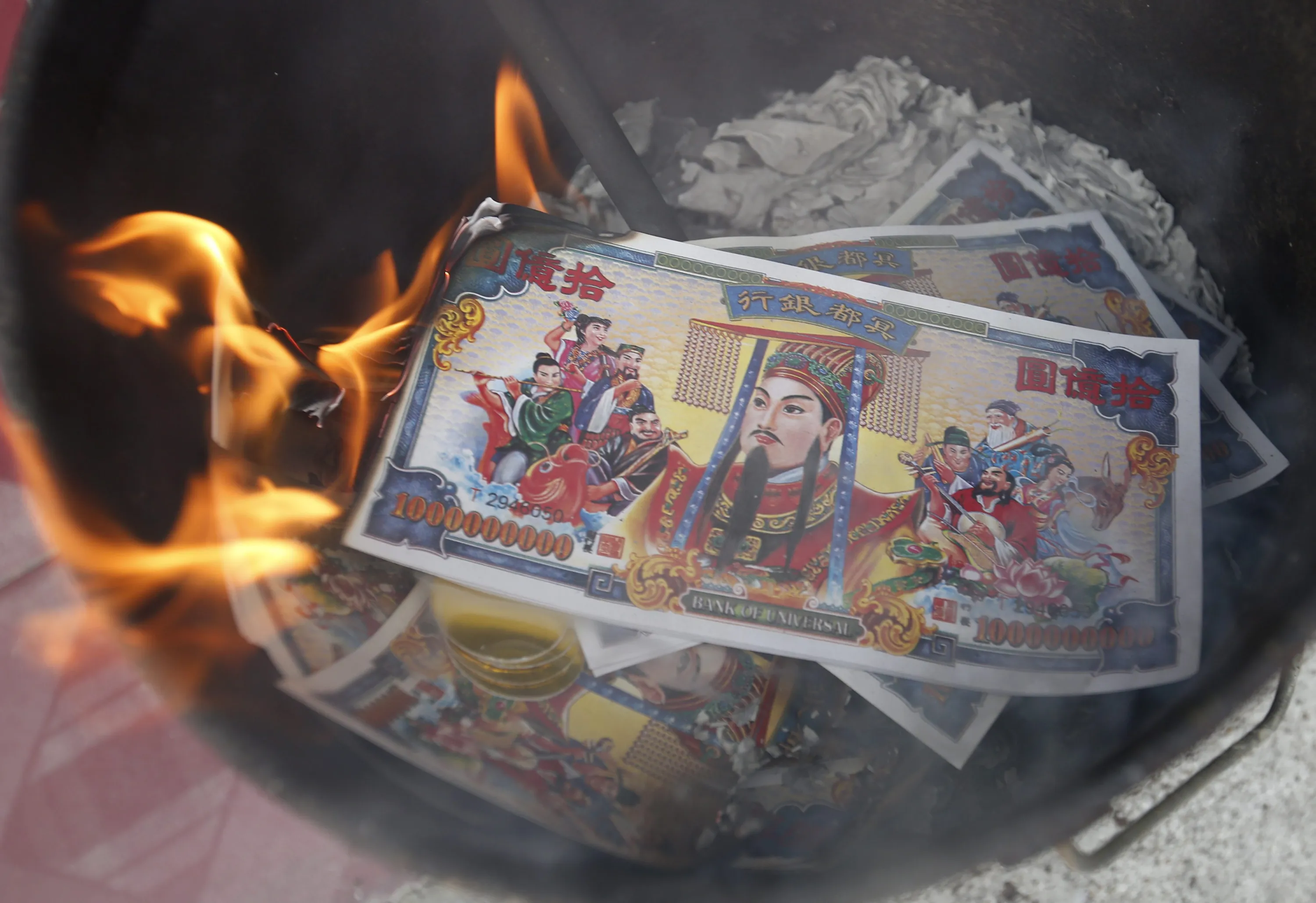 Paper money, called spirit money, is burnt in a bucket by an ethnic-Chinese Thai family in a traditional Chinese New Year ritual, believing that they will be passed onto their ancestors, at the front entrance of their shop-house home in Bangkok, Thailand, 18 February 2015. Food is laid on the table at the front of the house in a tradition to placate the mythical beast who is said to come on the first day of every New Year. Thousands of Thais of ethnic Chinese origin join Chinese around the world to celebrate Chinese New Year with customs starting on new years eve, 18 February, ahead of 19 February, the first day of the Year of the Goat. The festival is called also called Spring Festival. (Photo by Barbara Walton/EPA)