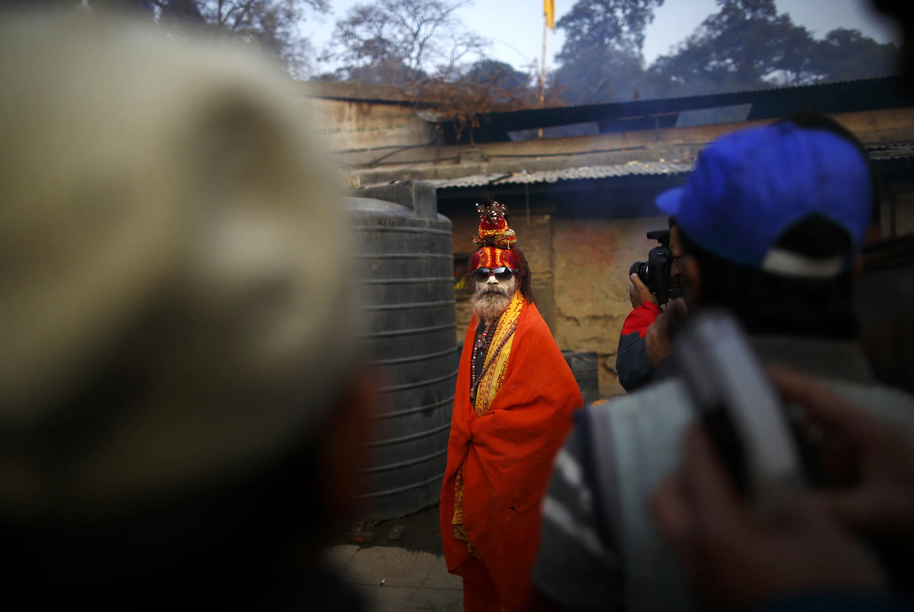 Devotees gather around a Hindu holy man, or sadhu, smeared with ashes at the premises of Pashupatinath Temple in Kathmandu February 16, 2015. Hindu holy men from Nepal and India come to this temple to take part in the Maha Shivaratri festival. Celebrated by Hindu devotees all over the world, Shivaratri is dedicated to Lord Shiva, and holy men mark the occasion by praying, smoking marijuana or smearing their bodies with ashes. (Photo by Navesh Chitrakar/Reuters)