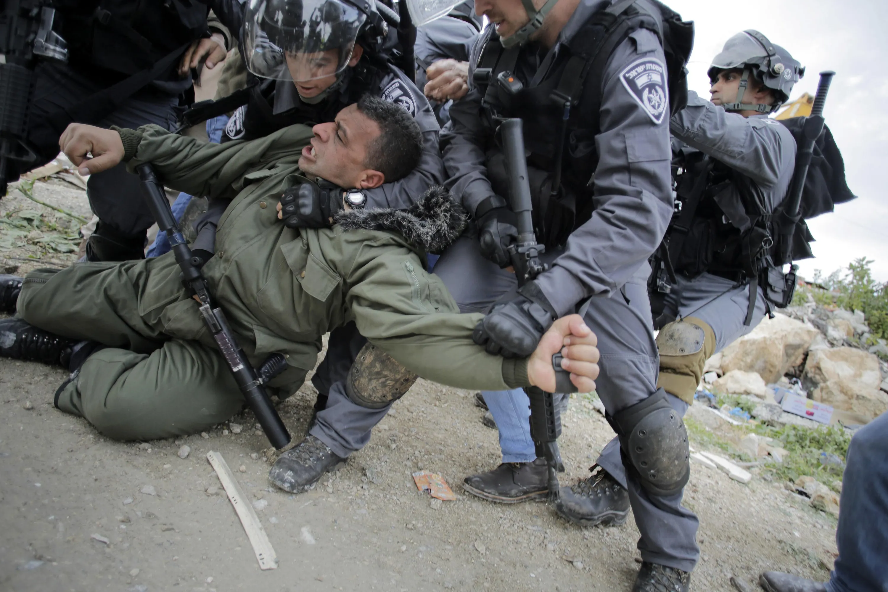Israeli border policemen detain a Palestinian man as they clear a protest on land that Palestinians say was confiscated by Israel for Jewish settlements, near the West Bank town of Abu Dis near Jerusalem February 16, 2015. (Photo by Ammar Awad/Reuters)
