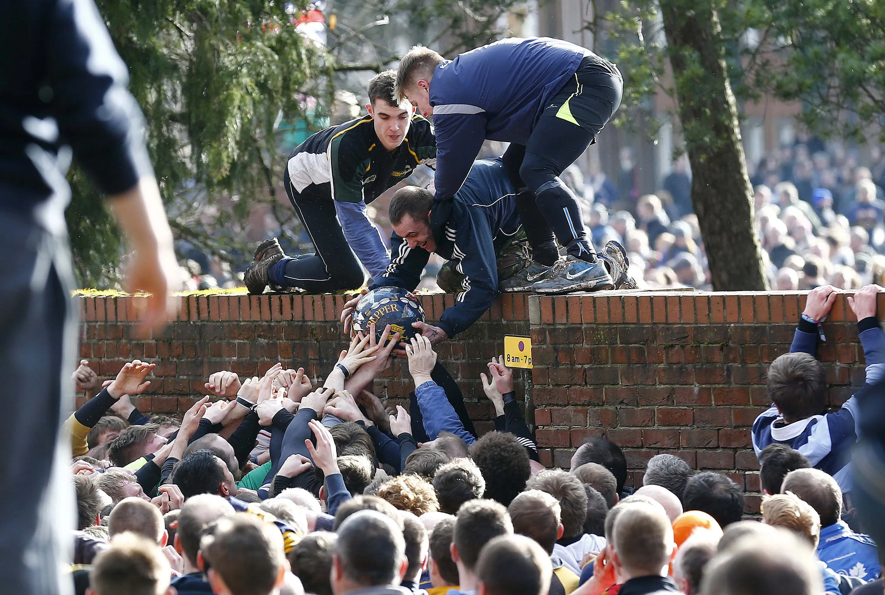 The ball is pulled from the hug during the annual Shrovetide football match in Ashbourne, central England February 17, 2015. The aim of the teams, the Up'ards and the Down'ards, is to score by tapping the ball three times on stone goal plinths three miles apart on the banks of the River Henmore. The game dates back to the 17th century. (Photo by Darren Staples/Reuters)