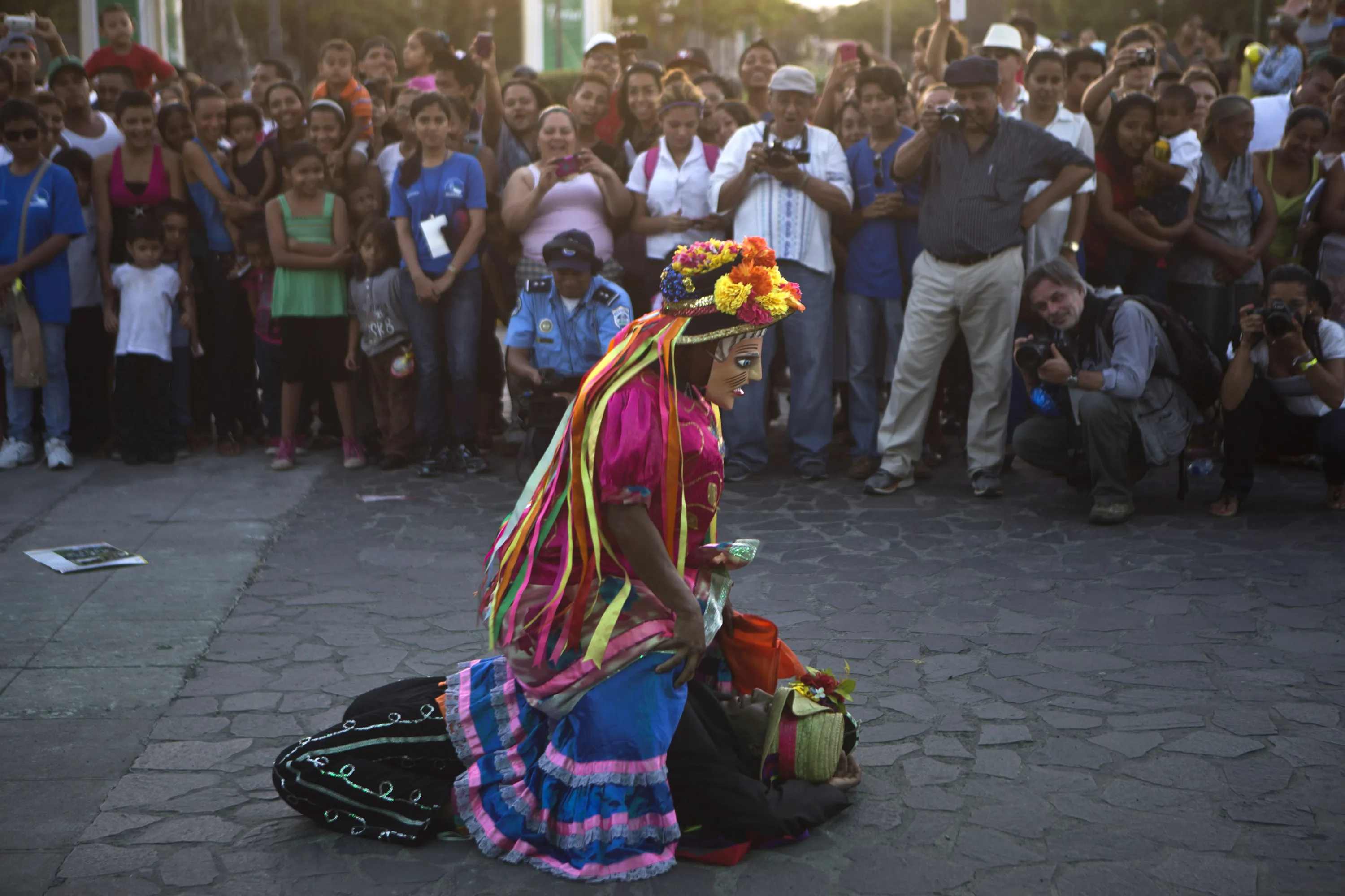 Traditional dancers perform, “El Viejo y La Vieja”, or “The Old Man and the Old Lady”, dance, before the start of a symbolic burial of violence, as part of the International Poetry Festival of Granada, in Granada, Nicaragua, Wednesday, February 18, 2015. (Photo by Esteban Felix/AP Photo)