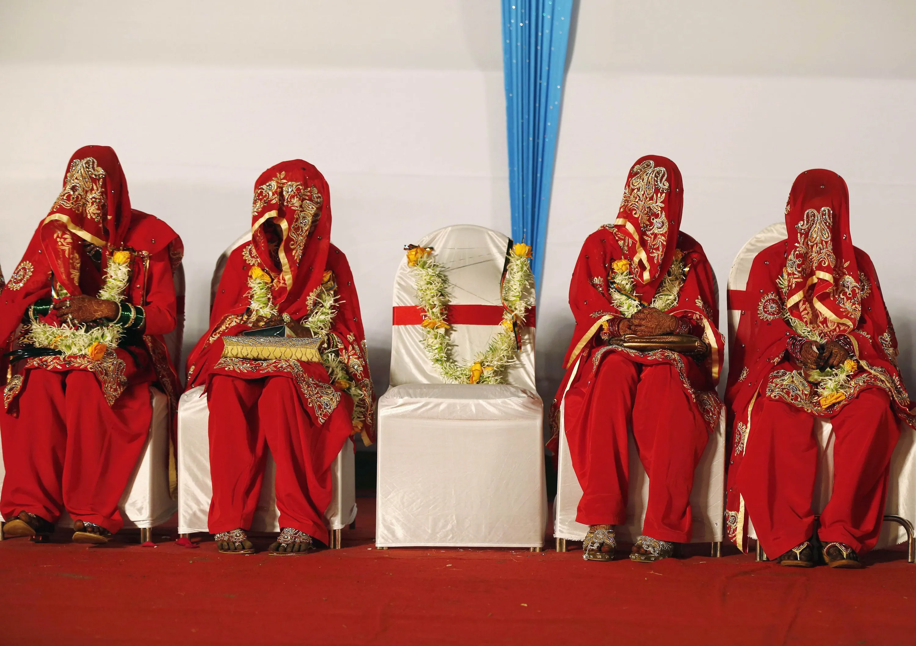 Muslim brides wait for their wedding ceremonies to start during a mass marriage ceremony in Mumbai February 15, 2015. A total of 51 Muslim couples on Sunday took wedding vows during the mass marriage ceremony organised by a Muslim voluntary organisation, organisers said. (Photo by Shailesh Andrade/Reuters)